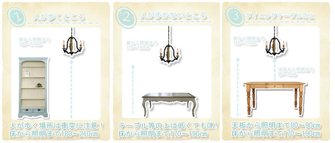 - 照明を取り付ける場所や空間に応じて異なります。人が歩く場所(リビングや廊下)では衝突しない高さにする、人が歩かない場所(テーブルの上など)は低く設置することが一般的です。高い場所に設置するほど視線から消え、インテリアとしては目立たなくなります。低く設置するほど視線に入りインテリアとして楽しめますが、圧迫感が出来ます。ご使用目的に応じてご検討くださいませ。