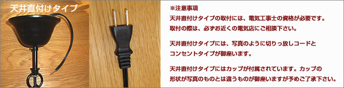 当店で取り扱っている照明器具の取り付け方法は2種類御座います。ひとつは「引掛けシーリング」対応の簡易取り付けです。もうひとつは電気工事が必要な「天井直付け」です。取り付け方法については商品ページをご覧下さい。