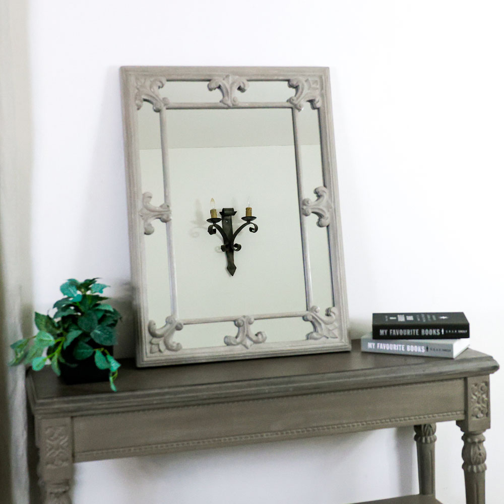 フレームがグレーのミラーは、空間に静かな存在感と奥行きをもたらします。