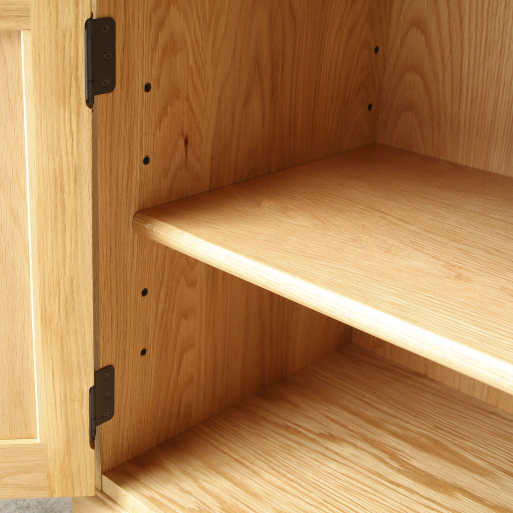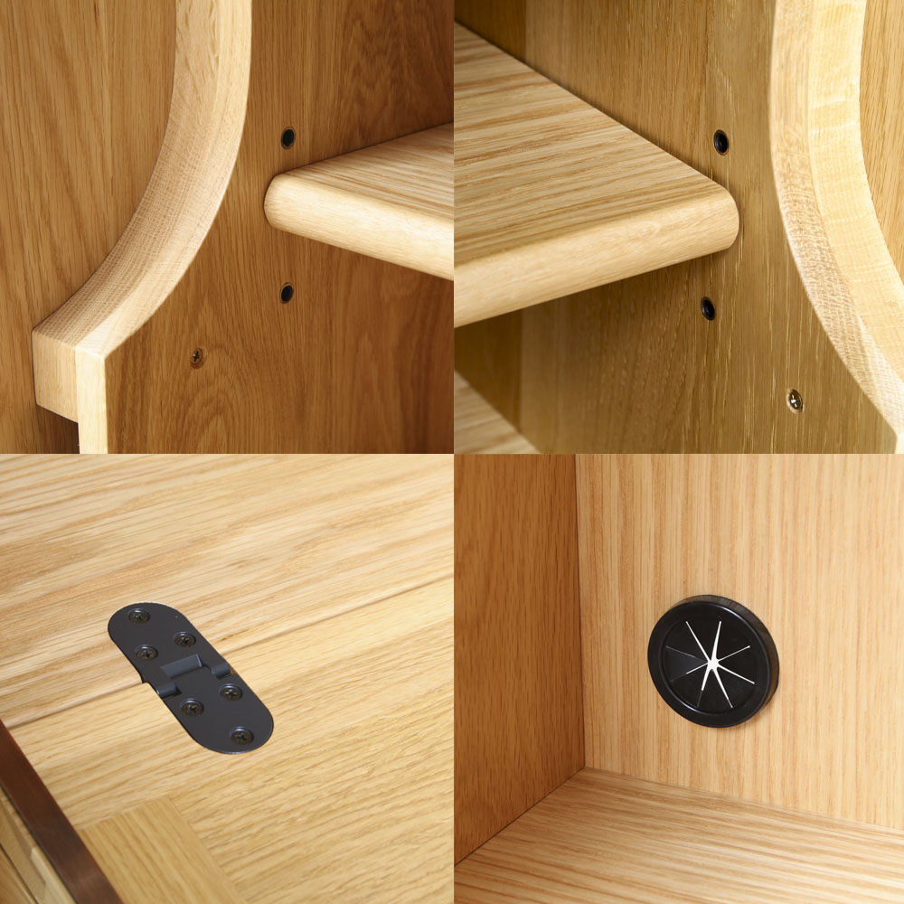 こちらの商品は完全受注生産品です。国内の工房にて生産いたします。国内・国外でも希少なナラ材を使い、職人の手で丁寧に仕上がってきます。こちらの特徴は独特な木目模様です。経年変化で色が変化していき、見た目にもお楽しみできます。また硬い素材ですので耐久性もございます。ぱっと見はチェストかと思いきや、上段の扉を開くとテーブルになる便利収納家具です。引出しが2つ。下段に収納スペース。ちょっとしたテーブルがほしいときに便利です。