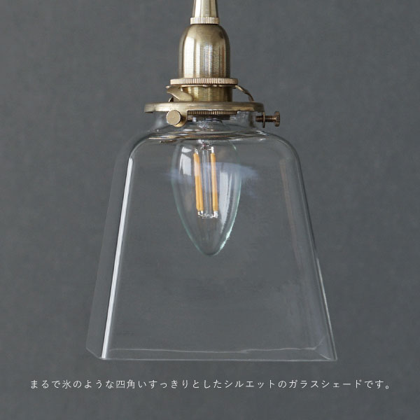 まるで氷のような四角いすっきりとしたシルエットのガラスシェードです。ガラス素材のシェードは光を通すので、点灯すると空間全体に明かりが広がります。昼間消灯している時も自然光を反射し、まるでオブジェのような存在感があります。光源が目に入りやすいので、吊るす高さや場所を工夫して、眩しく感じないちょうどいい位置に調整をして下さい。