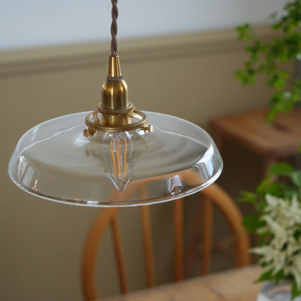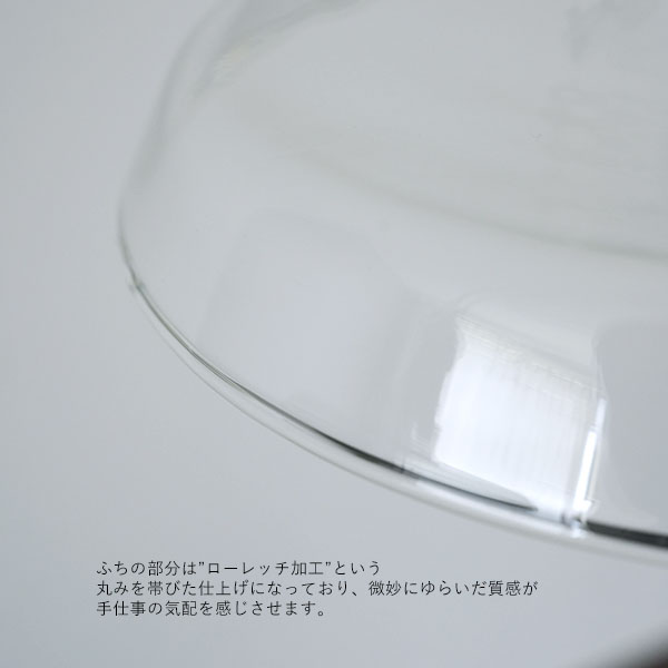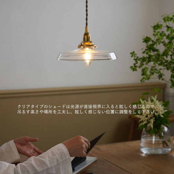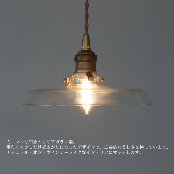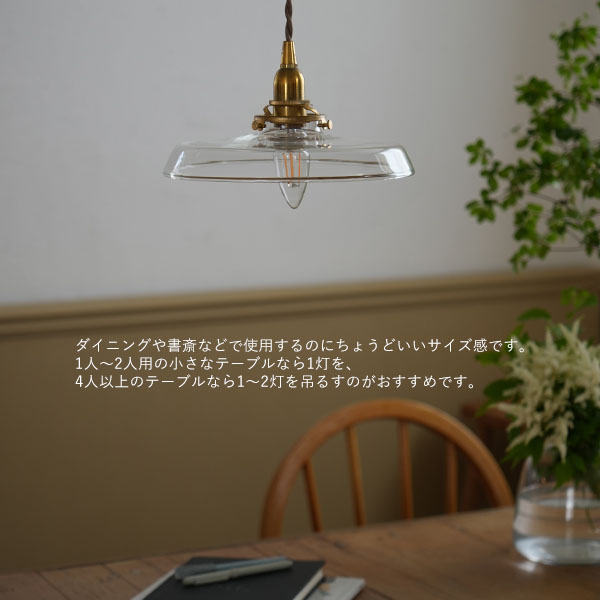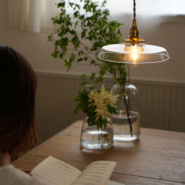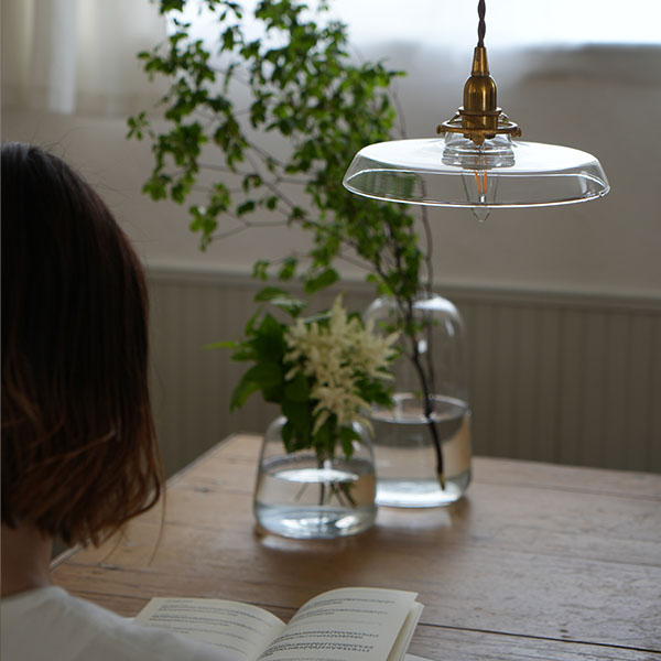 ミニマルな印象のガラス製。平たくて少しだけ裾広がりになったデザインは、工芸的な美しさを持っています。ナチュラル・北欧・ヴィンテーライクなインテリアにマッチします。ふちの部分は”ローレッチ加工”という丸みを帯びた仕上げになっており、微妙にゆらいだ質感が手仕事の気配を感じさせます。「ガラスシェード ミュレイ」シリーズは、ダイニングや書斎などで使用するのにちょうどいいサイズ感です。1人?2人用の小さなテーブルなら1灯を、4人以上のテーブルなら1?2灯を吊るすのがおすすめです。クリアタイプのシェードは光源が直接視界に入ると眩しく感じるので、吊るす高さや場所を工夫し、眩しく感じない位置に調整をして下さい。