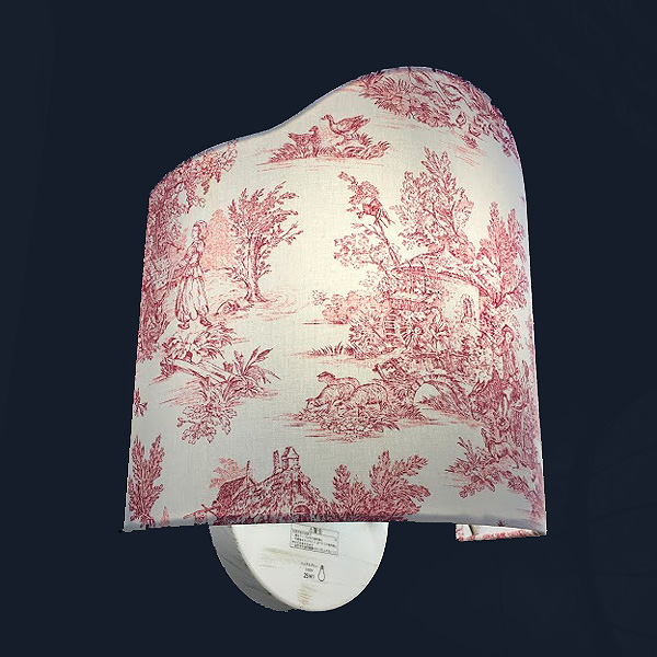 18世紀フランスでは、インド更紗の技法から人物像や生活風景などが描かれたテキスタイルが誕生し、代表的な生産地ジュイ・アン・ジョザスの名から、Toile de jouy (トワル・ド・ジュイ)と呼ばれています。ルイ王朝やナポレオンをはじめ、かのマリーアントワネットにも愛されたトワル・ド・ジュイをシェードに取り入れた素敵なウォールランプです。