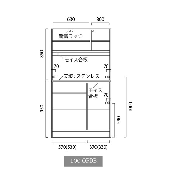 | その他素材 | 天板:ステンレス 側面:プリント 背面:防湿シート OP部分、スライド部分上部にモイス装備 |
