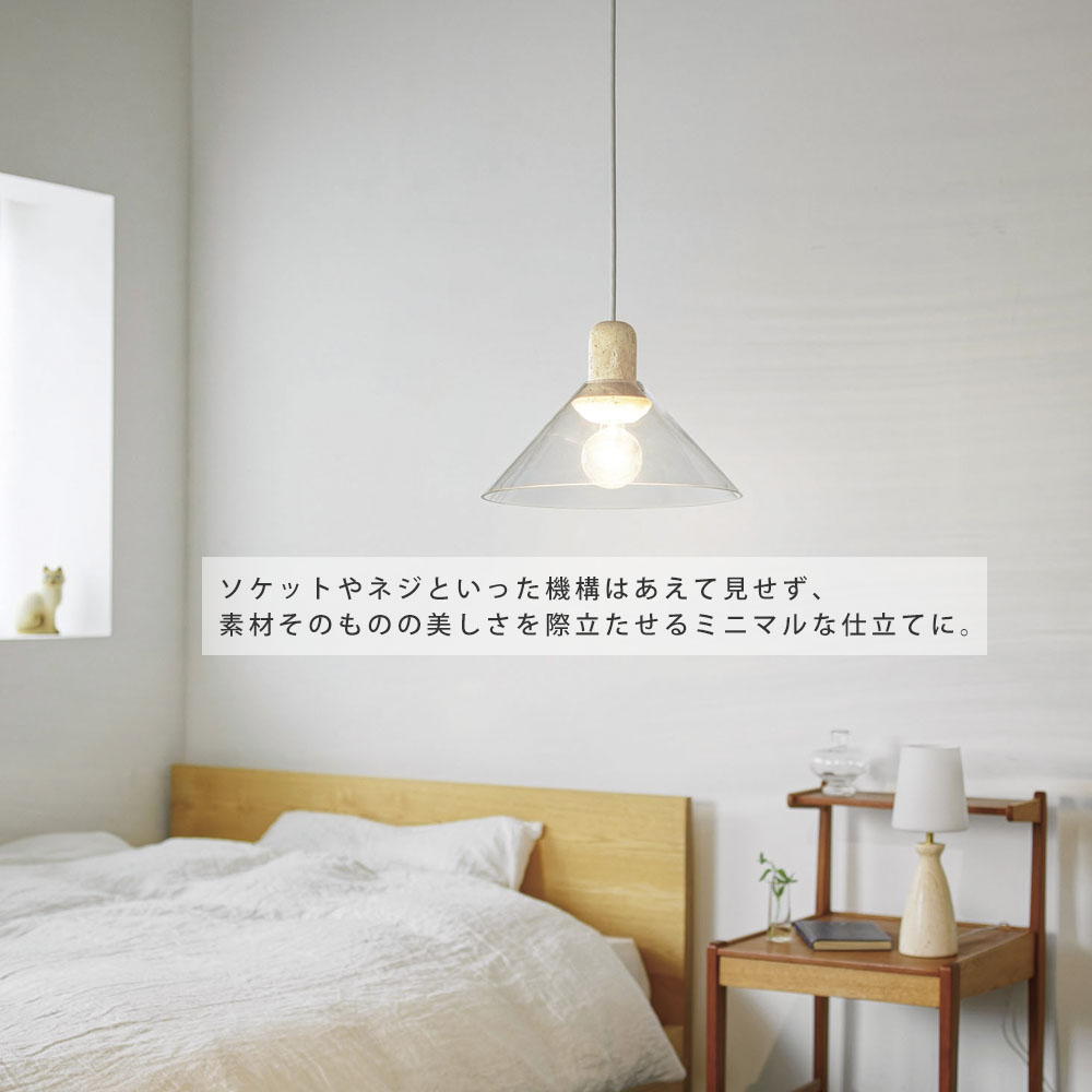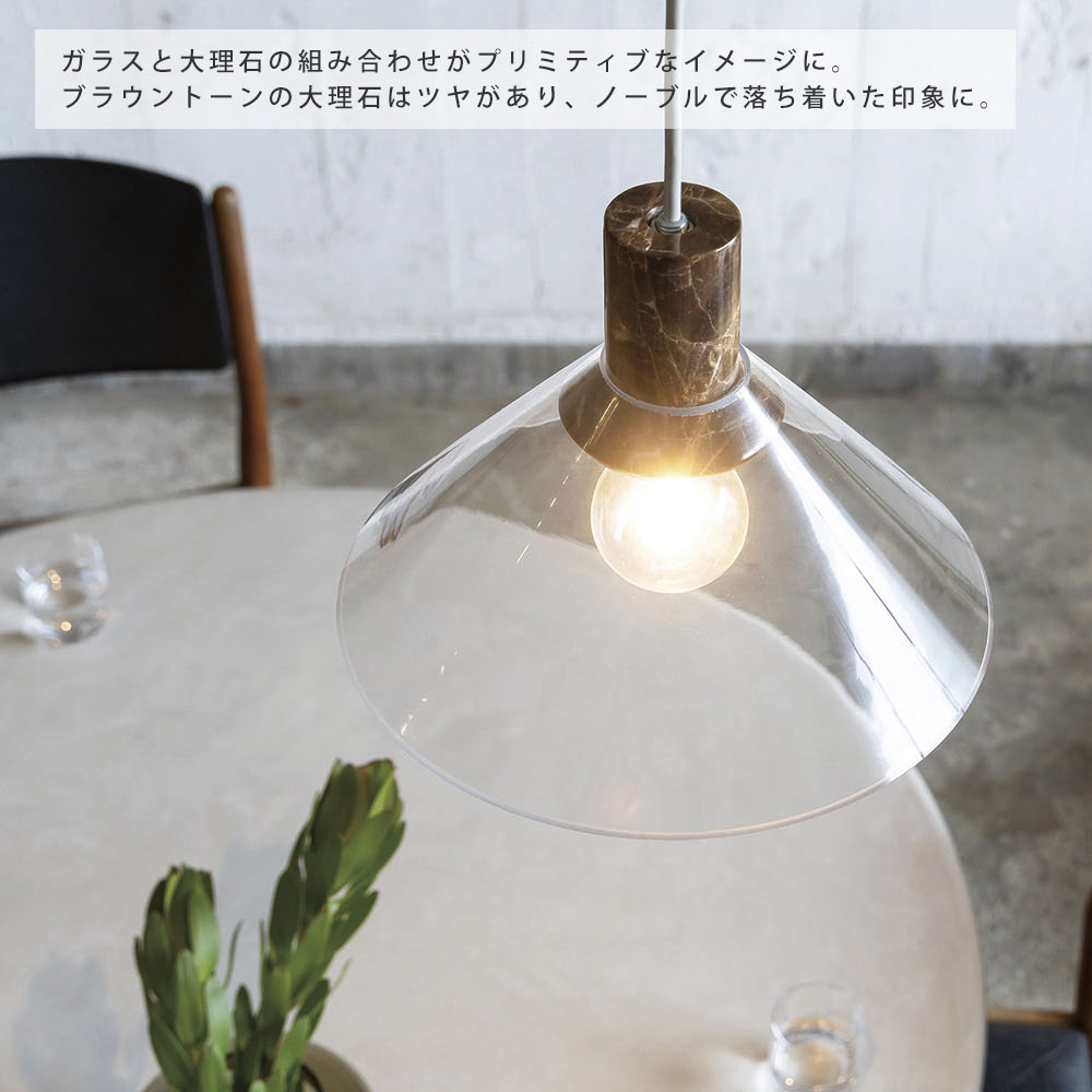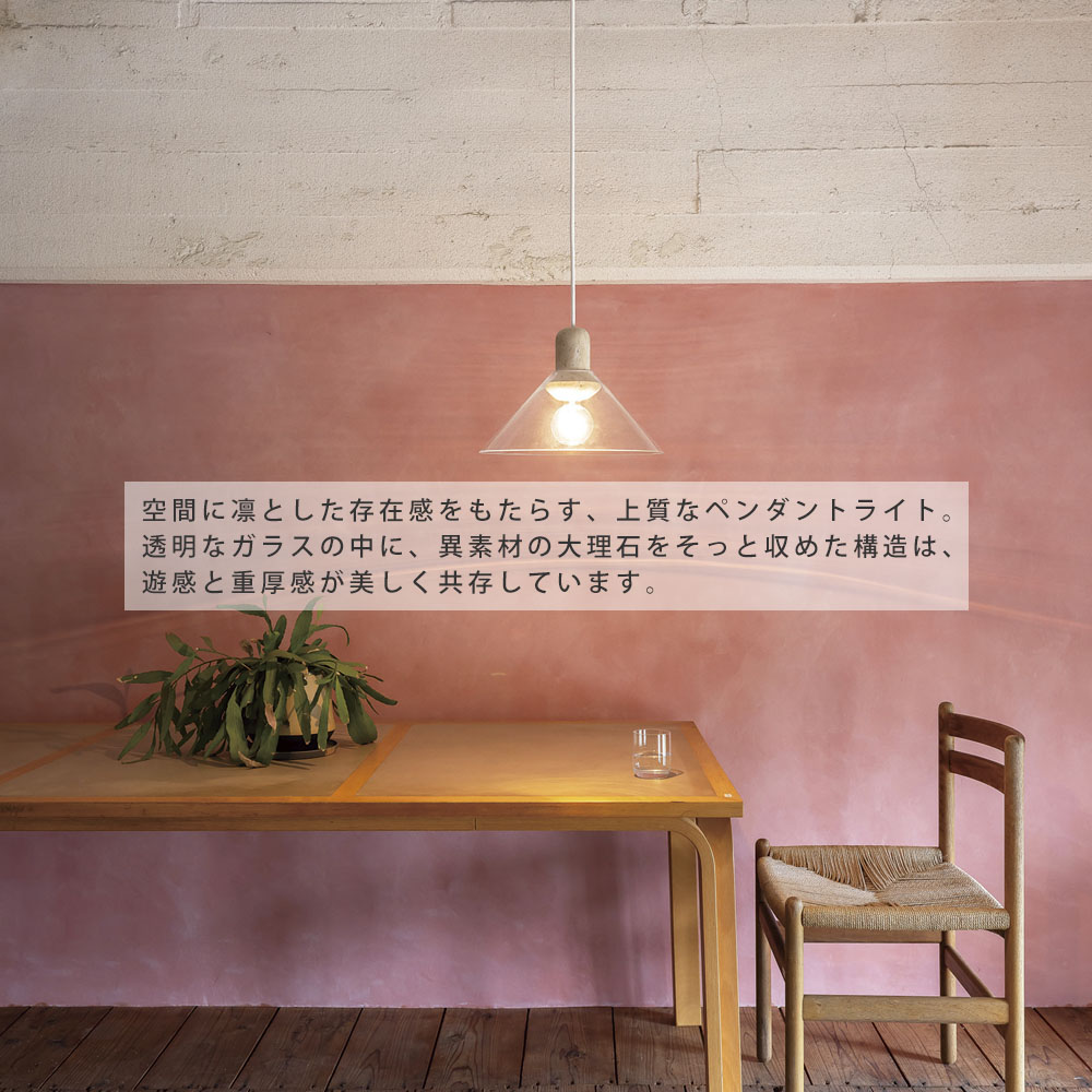 空間に凛とした存在感をもたらす、上質なペンダントライト。透明なガラスの中に、異素材の大理石をそっと収めた構造は、浮遊感と重厚感が美しく共存しています。ソケットやネジといった機構はあえて見せず、素材そのものの美しさを際立たせるミニマルな仕立てに。