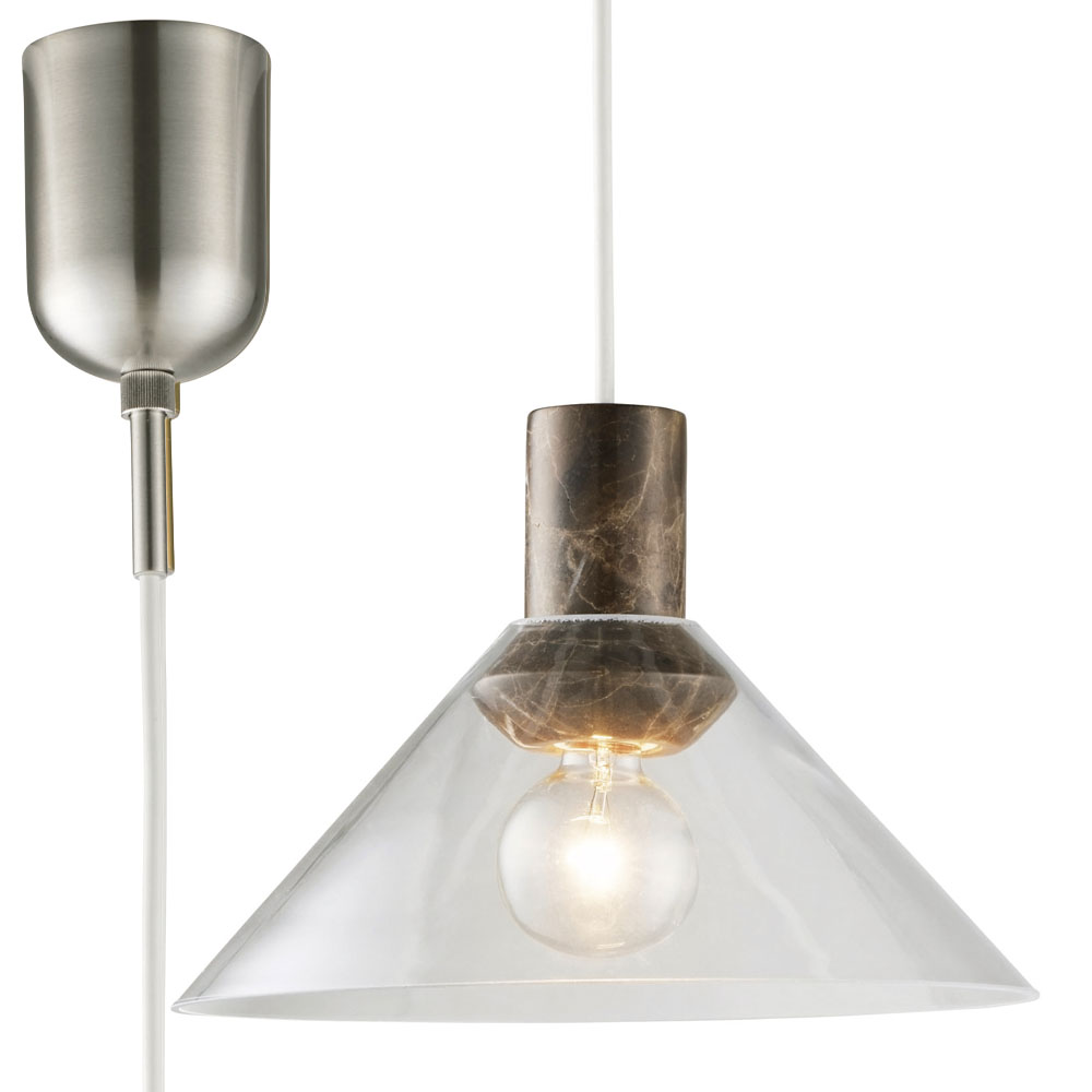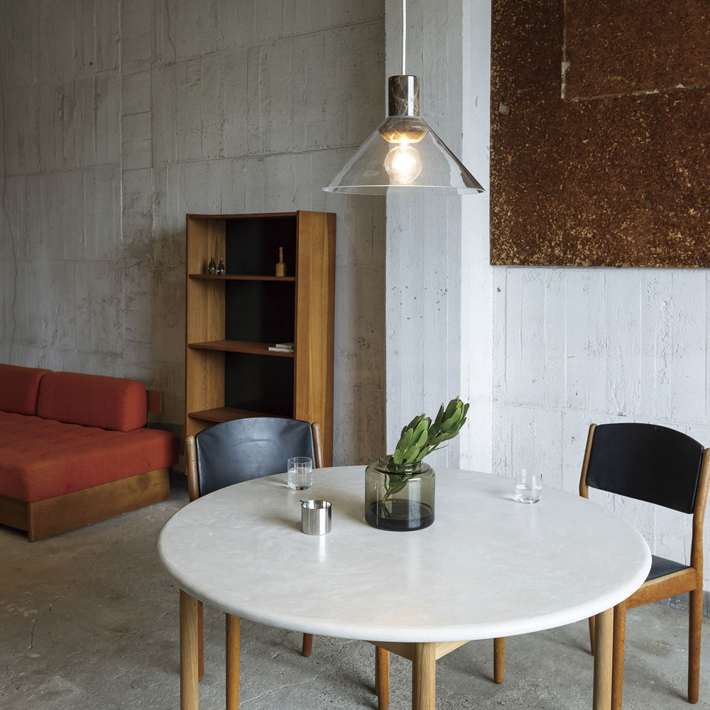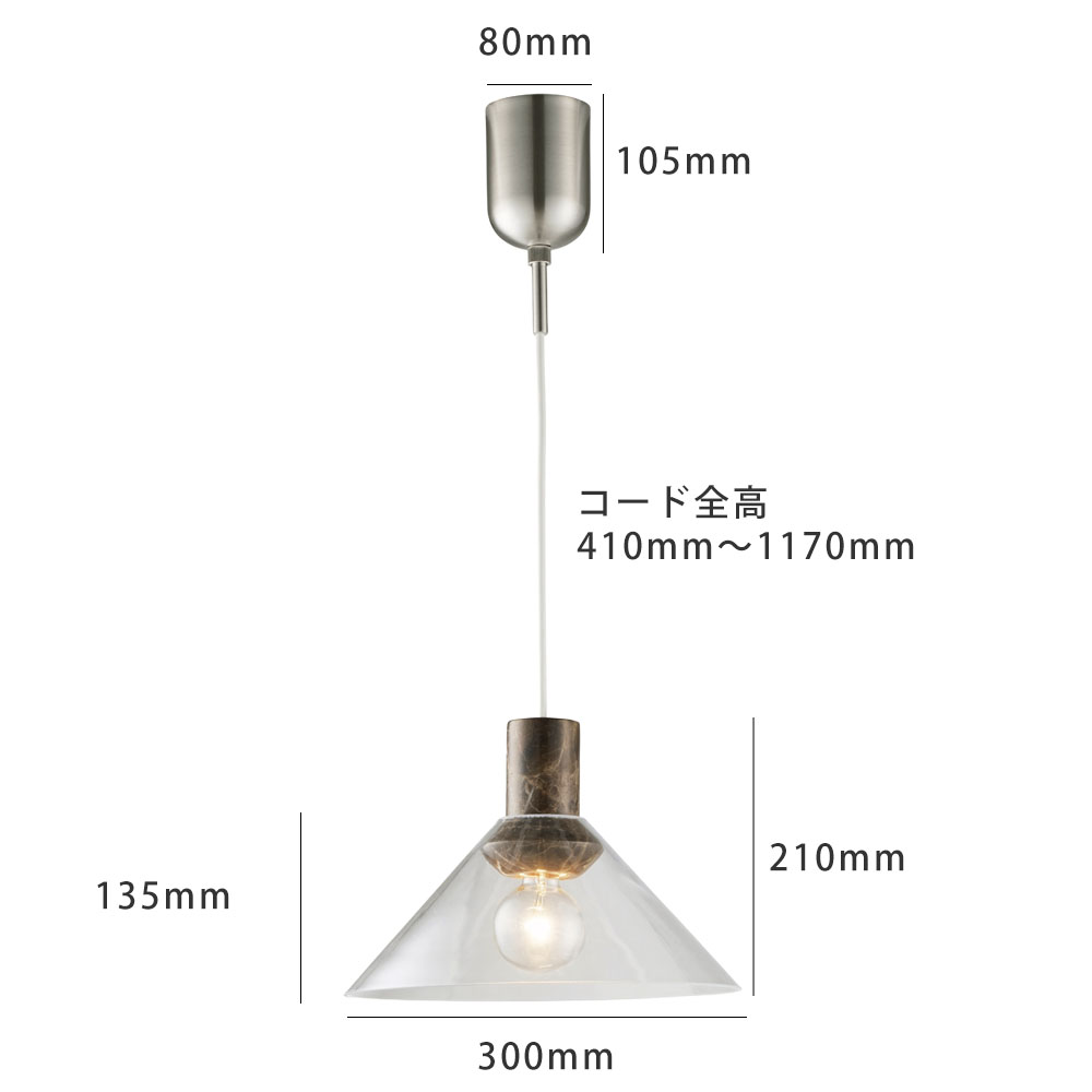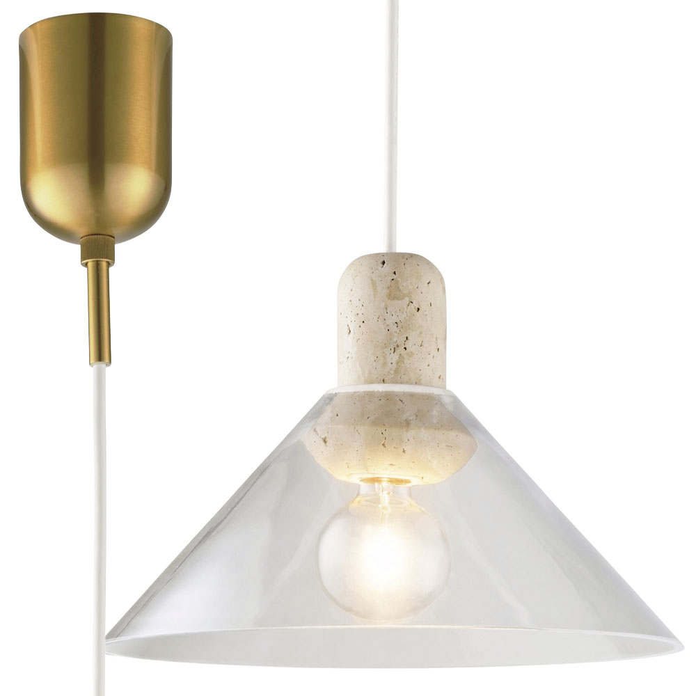 空間に凛とした存在感をもたらす、上質なペンダントライト。透明なガラスの中に、異素材の大理石をそっと収めた構造は、浮遊感と重厚感が美しく共存しています。ソケットやネジといった機構はあえて見せず、素材そのものの美しさを際立たせるミニマルな仕立てに。