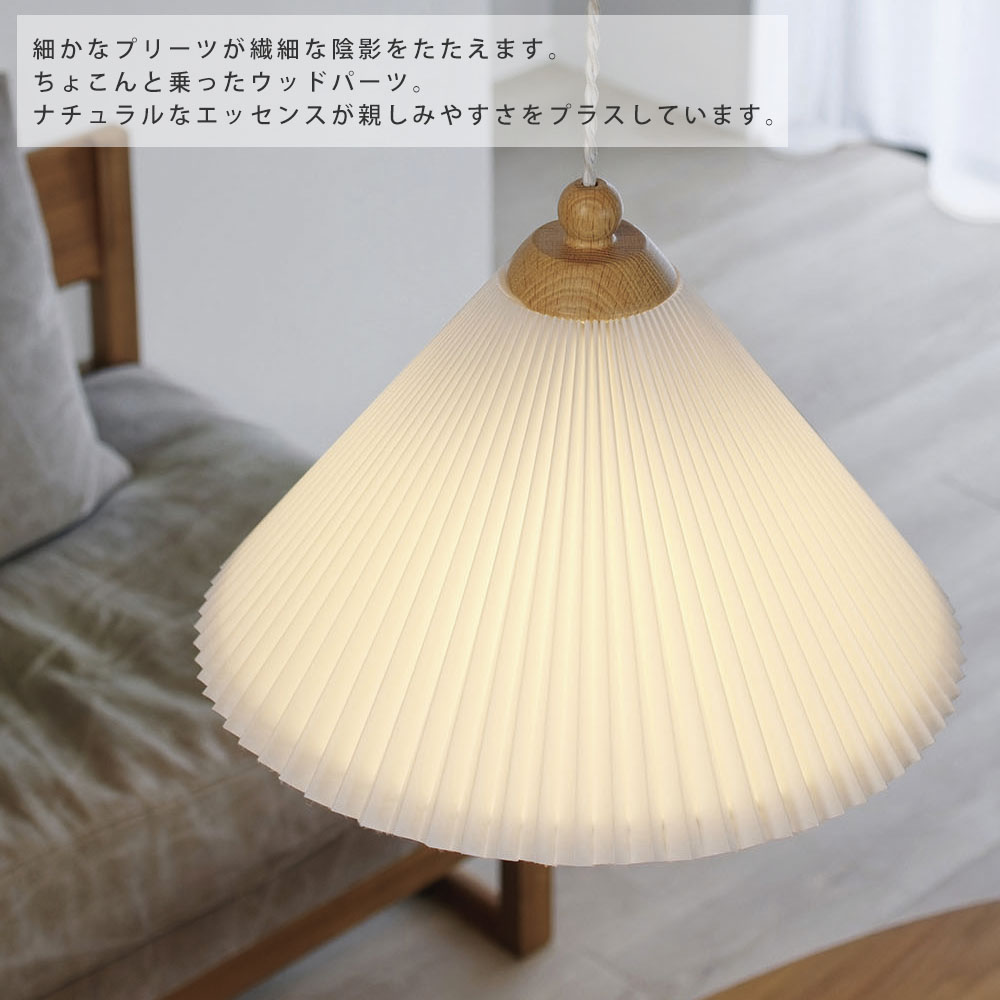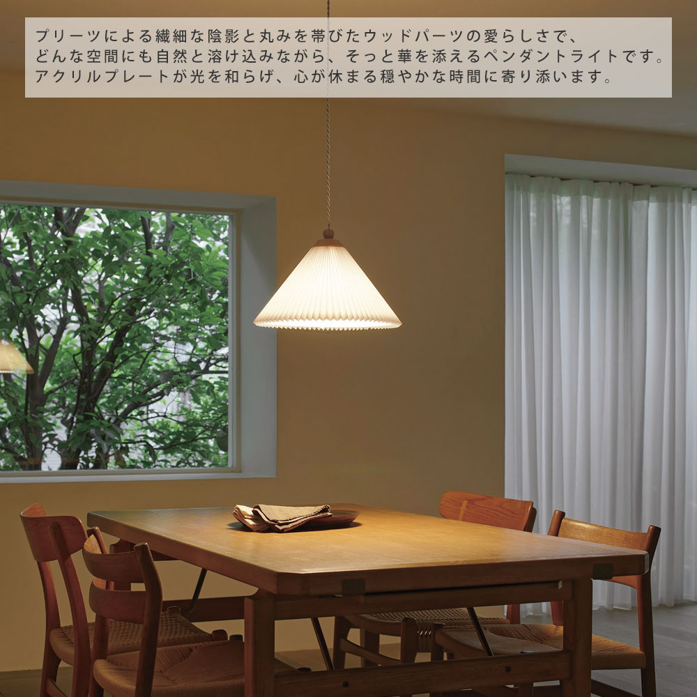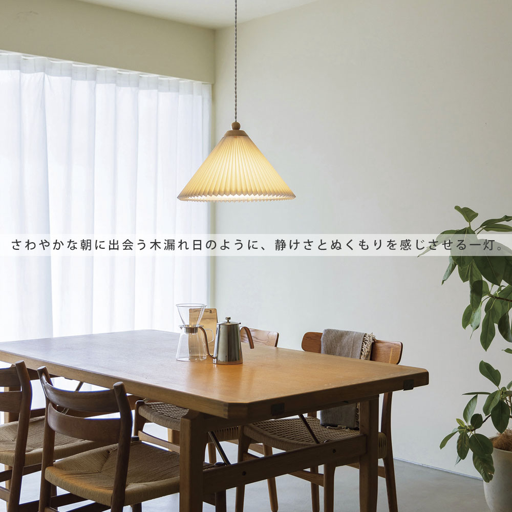 さわやかな朝に出会う木漏れ日のように、静けさとぬくもりを感じさせる一灯。プリーツによる繊細な陰影と丸みを帯びたウッドパーツの愛らしさで、どんな空間にも自然と溶け込みながら、そっと華を添えるペンダントライトです。アクリルプレートが光を和らげ、心が休まる穏やかな時間に寄り添います。