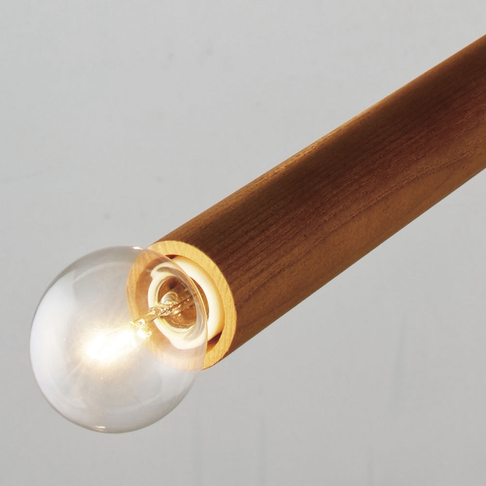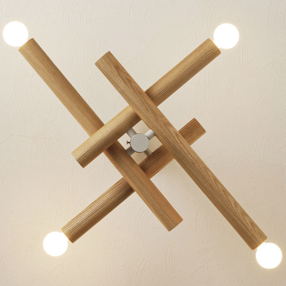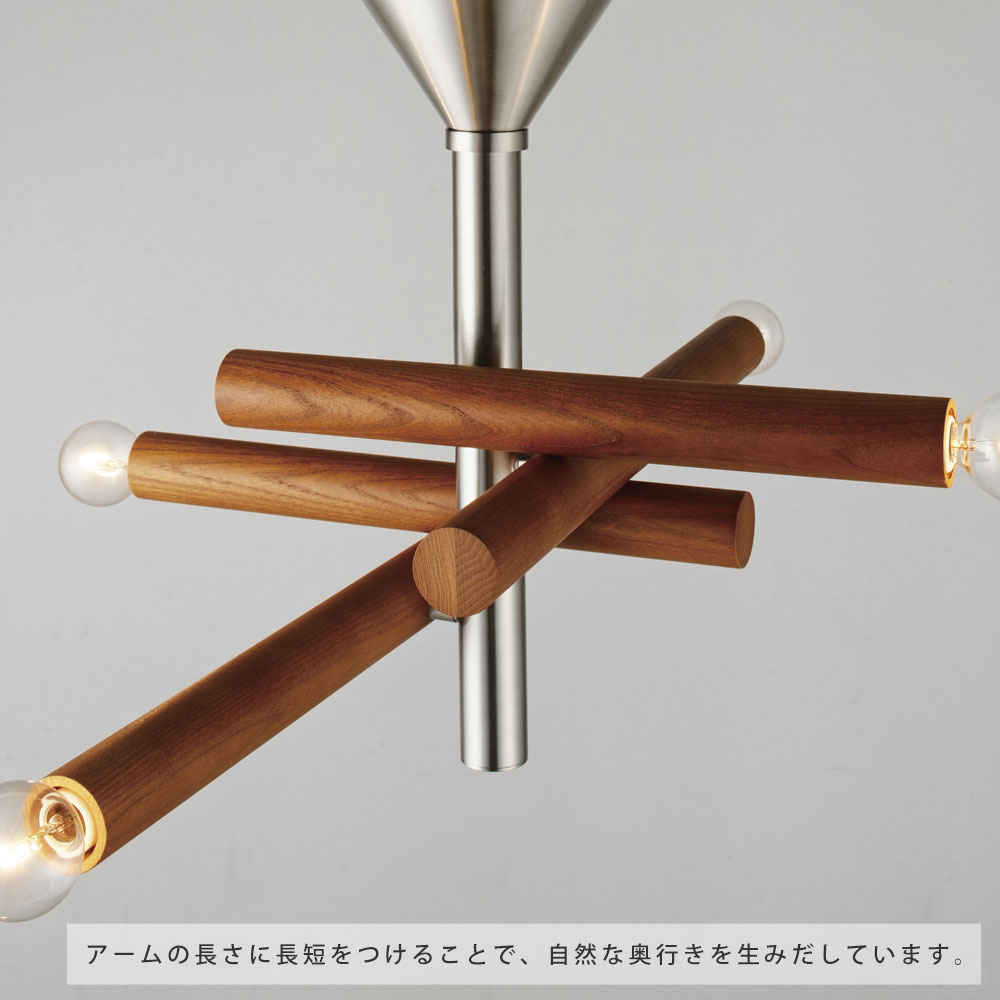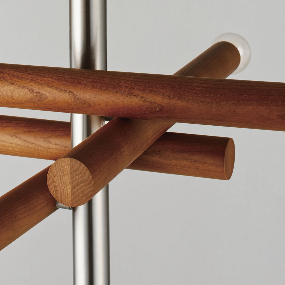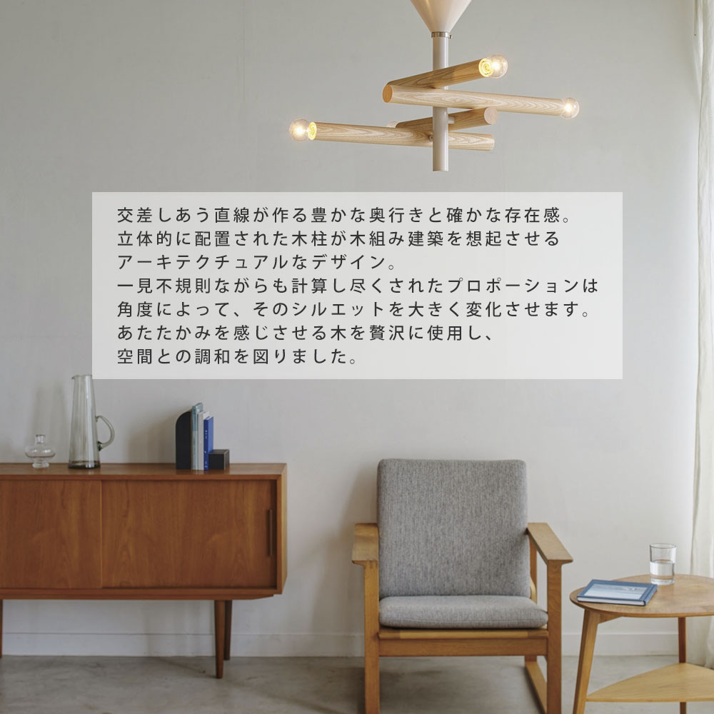交差しあう直線が作る豊かな奥行きと確かな存在感。立体的に配置された木柱が木組み建築を想起させるアーキテクチュアルなデザイン。一見不規則ながらも計算し尽くされたプロポーションは角度によって、そのシルエットを大きく変化させます。あたたかみを感じさせる木を贅沢に使用し、空間との調和を図りました。