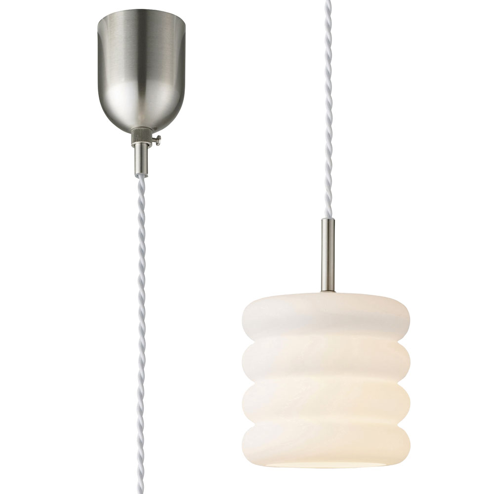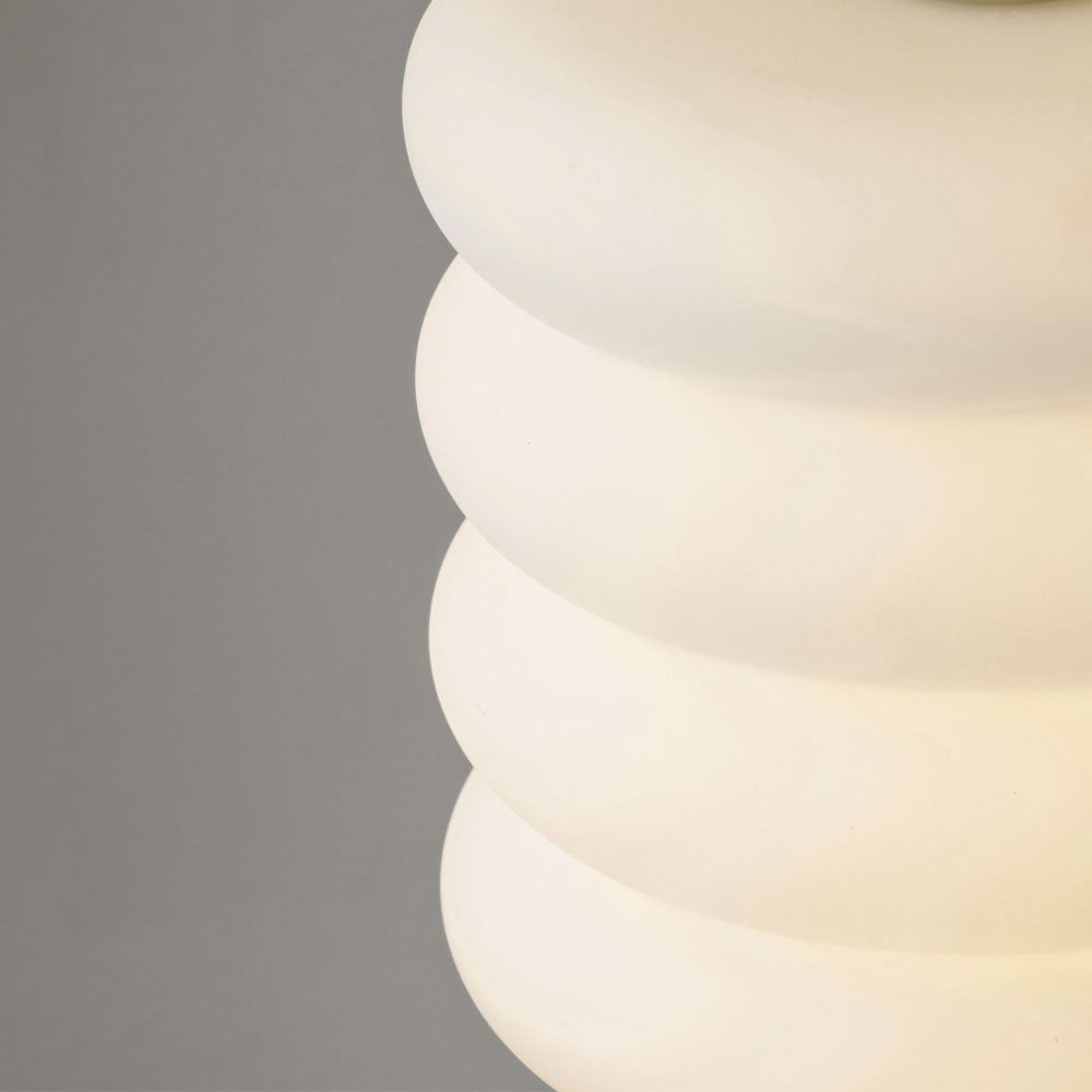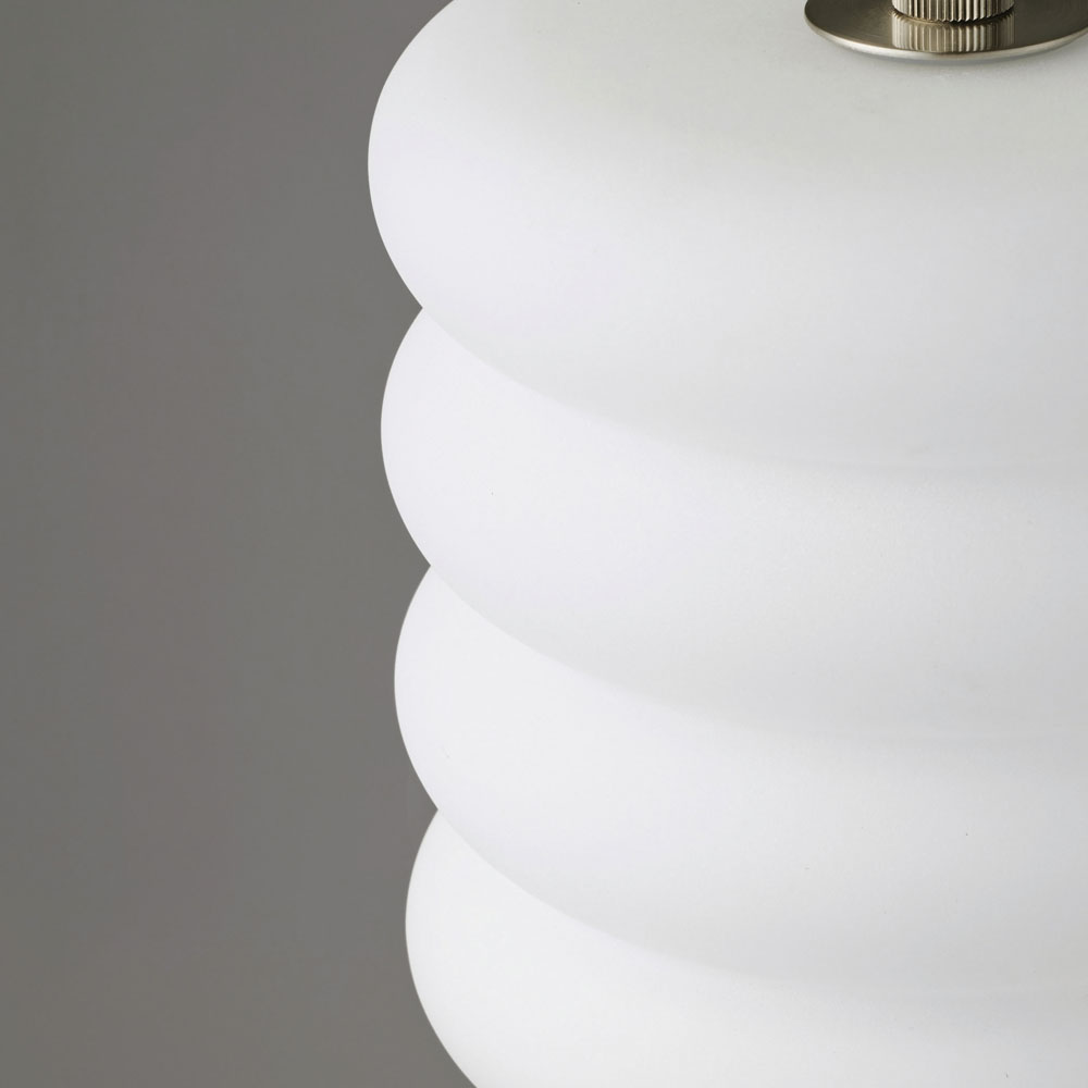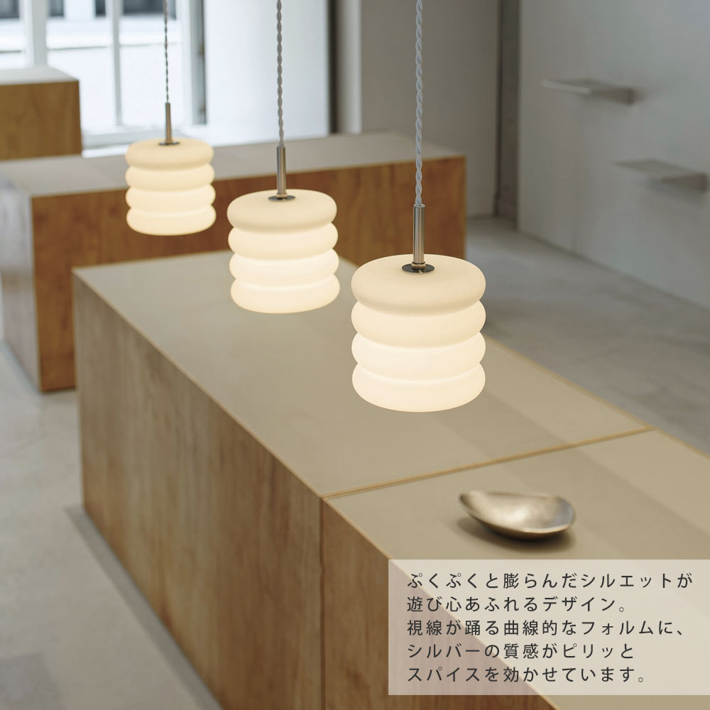 ぷくぷくと膨らんだシルエットが遊び心あふれるデザイン。視線が踊る曲線的なフォルムに、シルバーの質感がピリッとスパイスを効かせています。マットなガラスから漏れる柔らかな光が、ファニーで実験的な空間に。スペースエイジを連想させる個性的でポップなかたちが、こだわりの世界観を演出します。