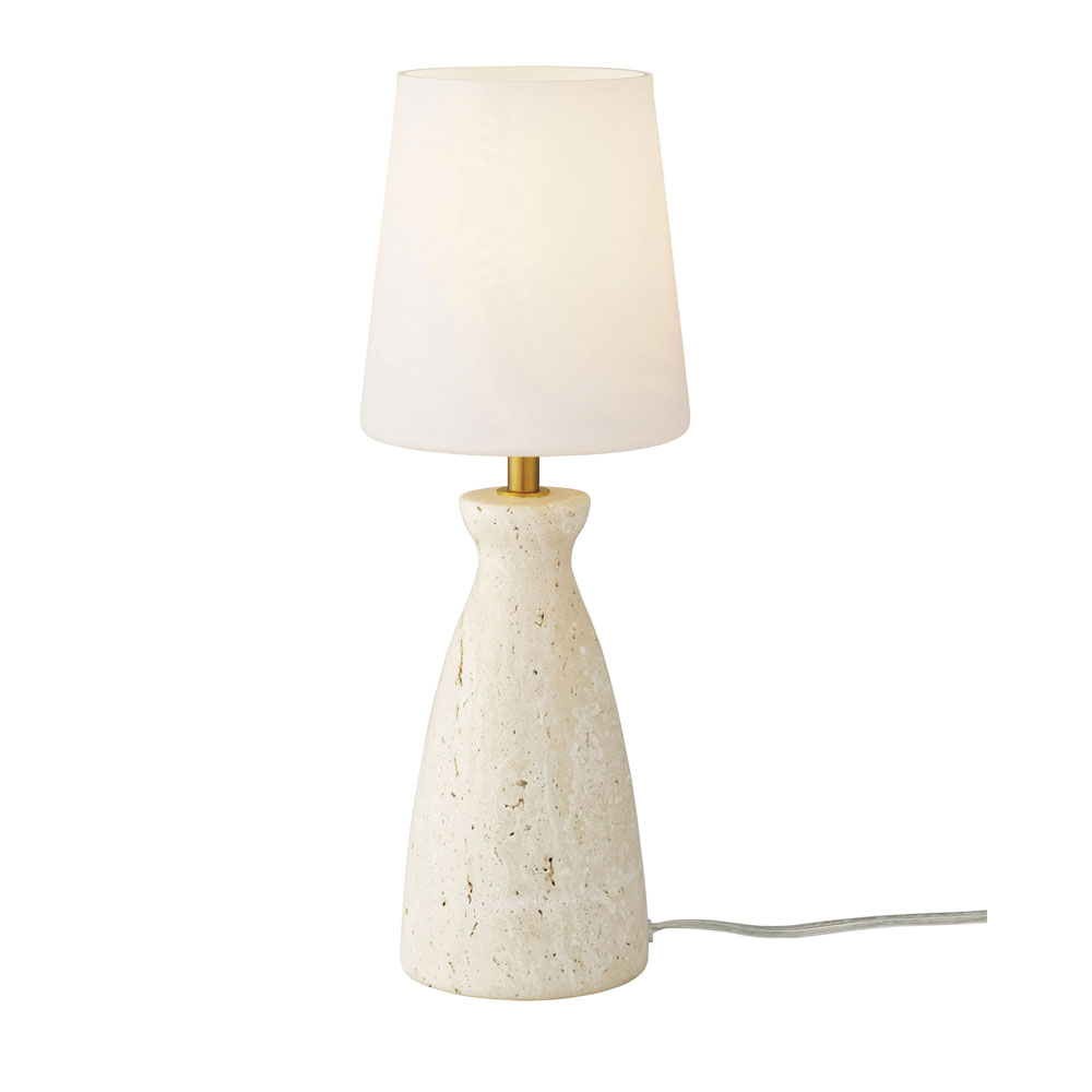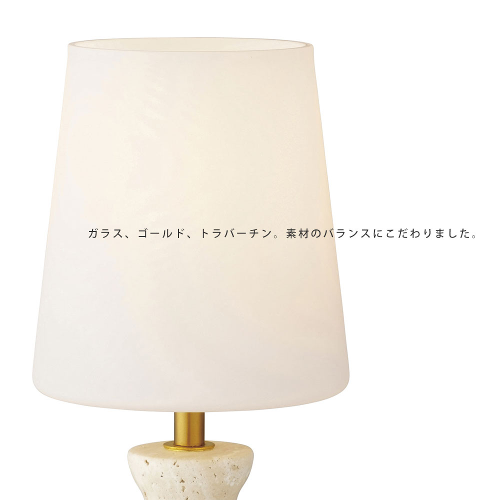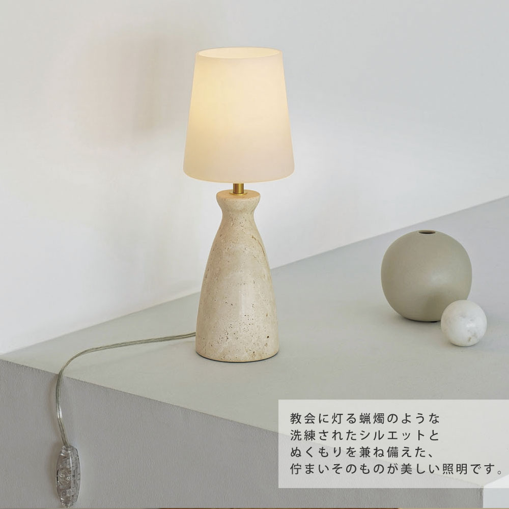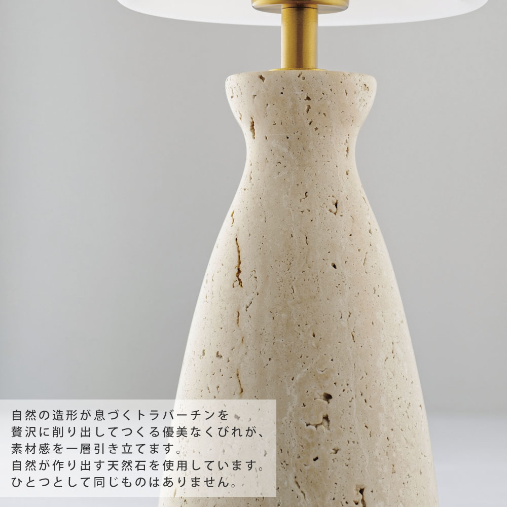 教会に灯る蝋燭のような洗練されたシルエットとぬくもりを兼ね備えた、佇まいそのものが美しい照明です。自然の造形が息づくトラバーチンを贅沢に削り出してつくる優美なくびれが、素材感を一層引き立てます。フロストガラスから伝わる光が、プリミティブな大理石やわずかに見えるゴールドのディテールを照らし出します。