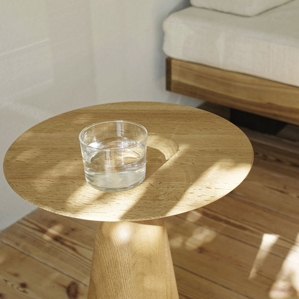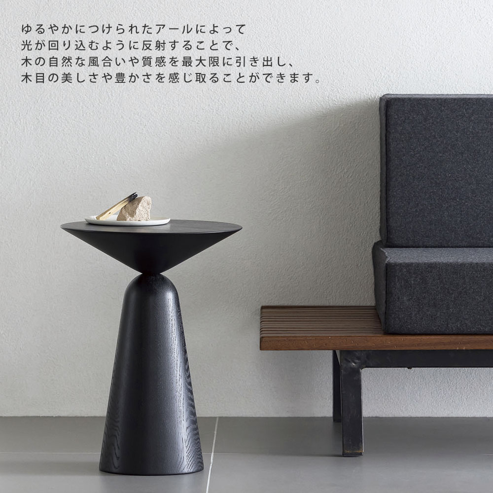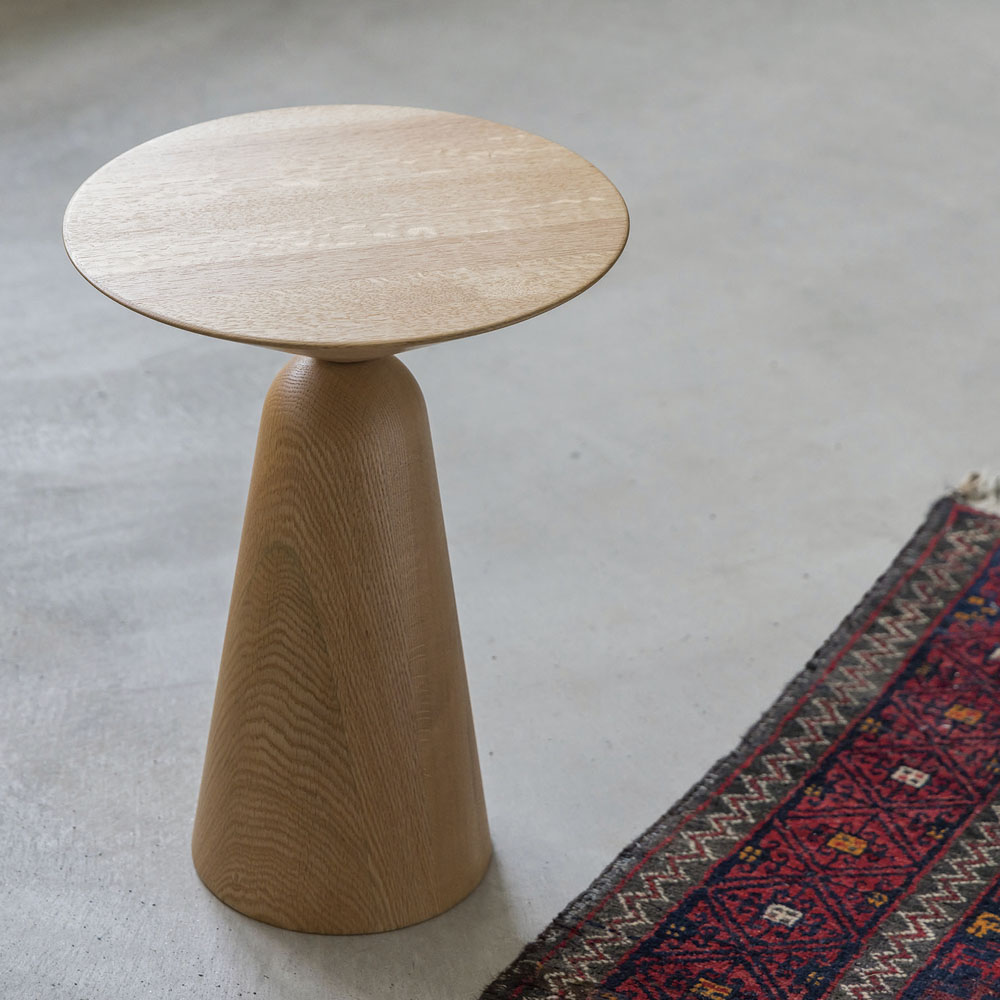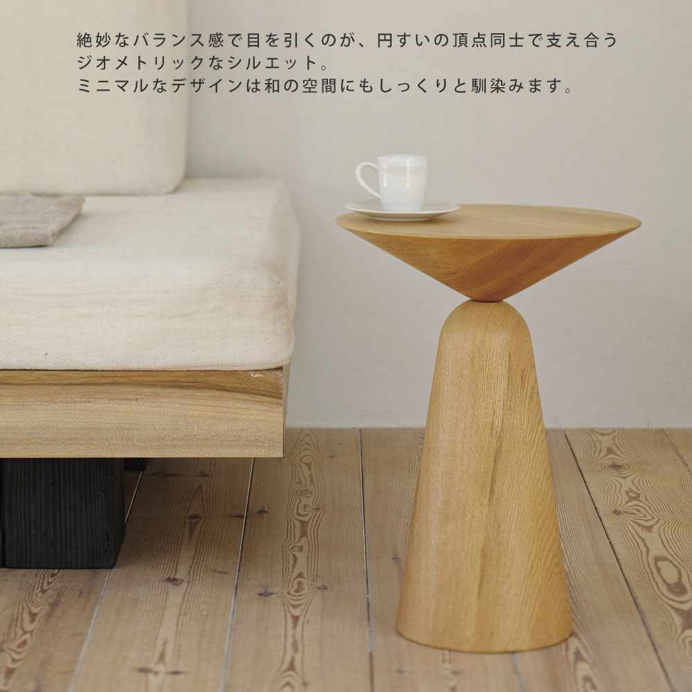 久々にサイドテーブルの新作をご用意しました。絶妙なバランス感で目を引くのが、円すいの頂点同士で支え合うジオメトリックなシルエット。ミニマルなデザインは和の空間にもしっくりと馴染みます。ゆるやかにつけられたアールによって光が回り込むように反射することで、木の自然な風合いや質感を最大限に引き出し、木目の美しさや豊かさを感じ取ることができます。贅沢に使用されたオーク材の手触りも楽しめ、木の高級感と重厚感がありながらも、収まりのいい低めのサイズ感で落ち着きを与えます。