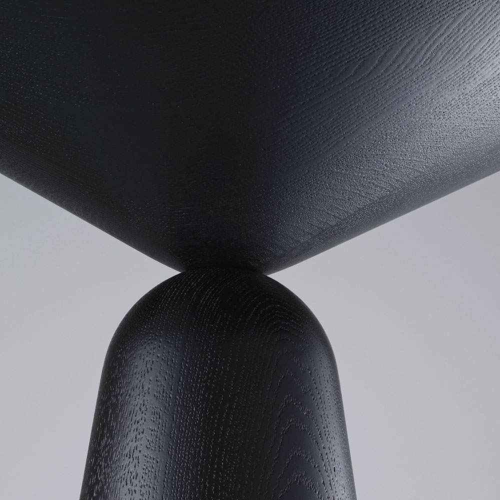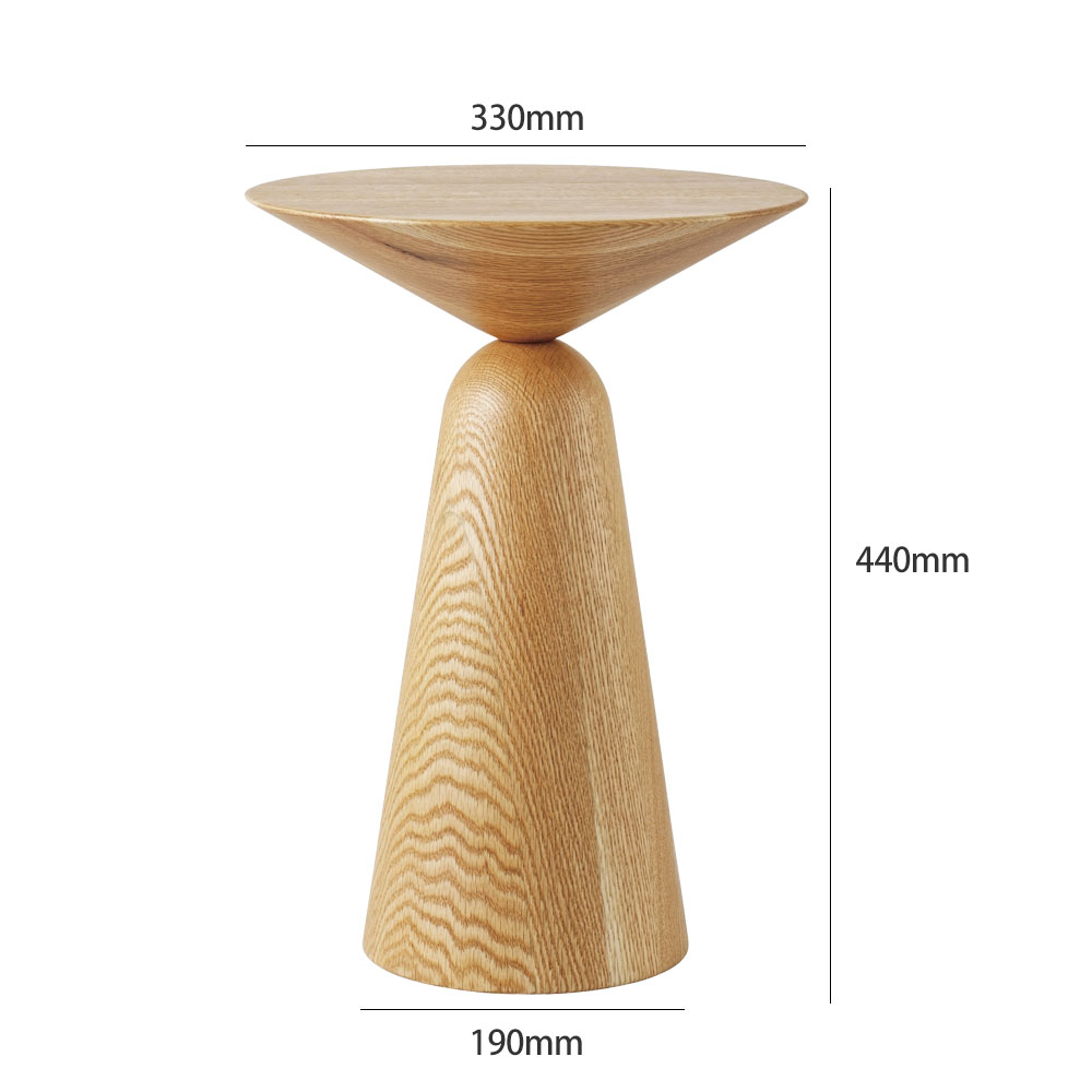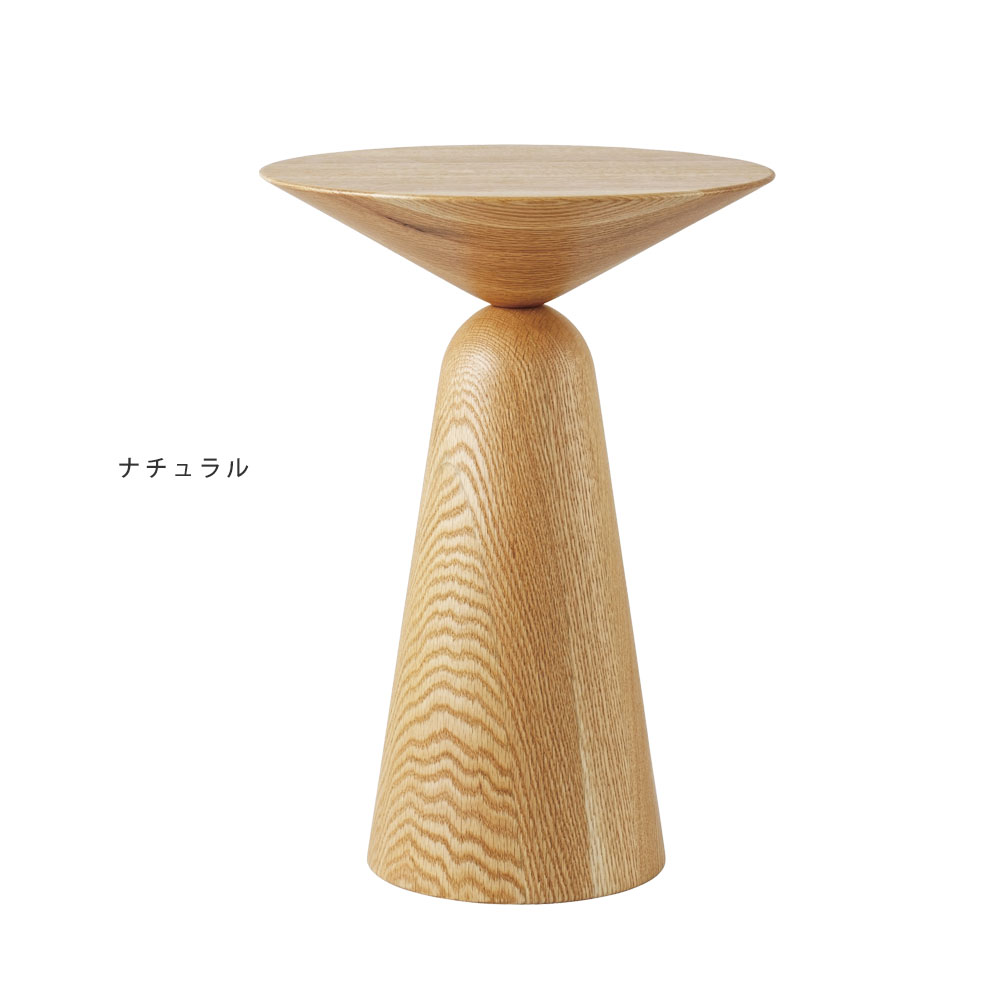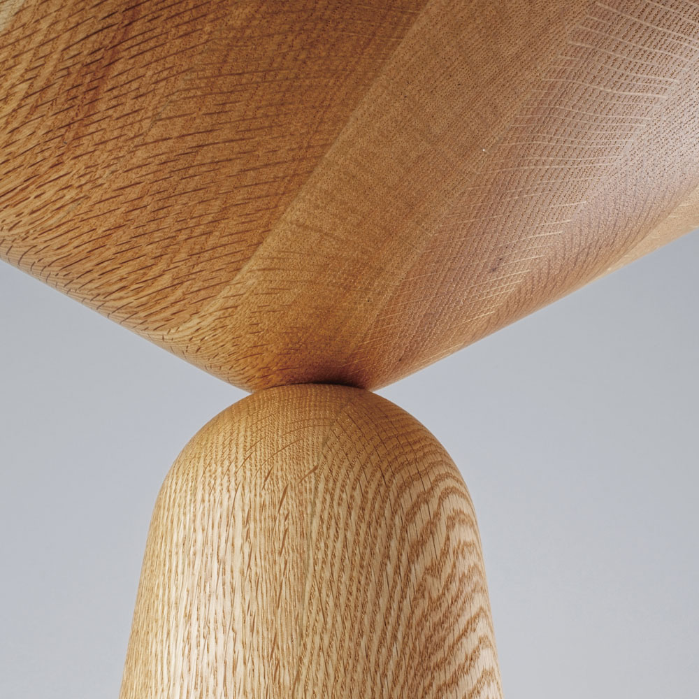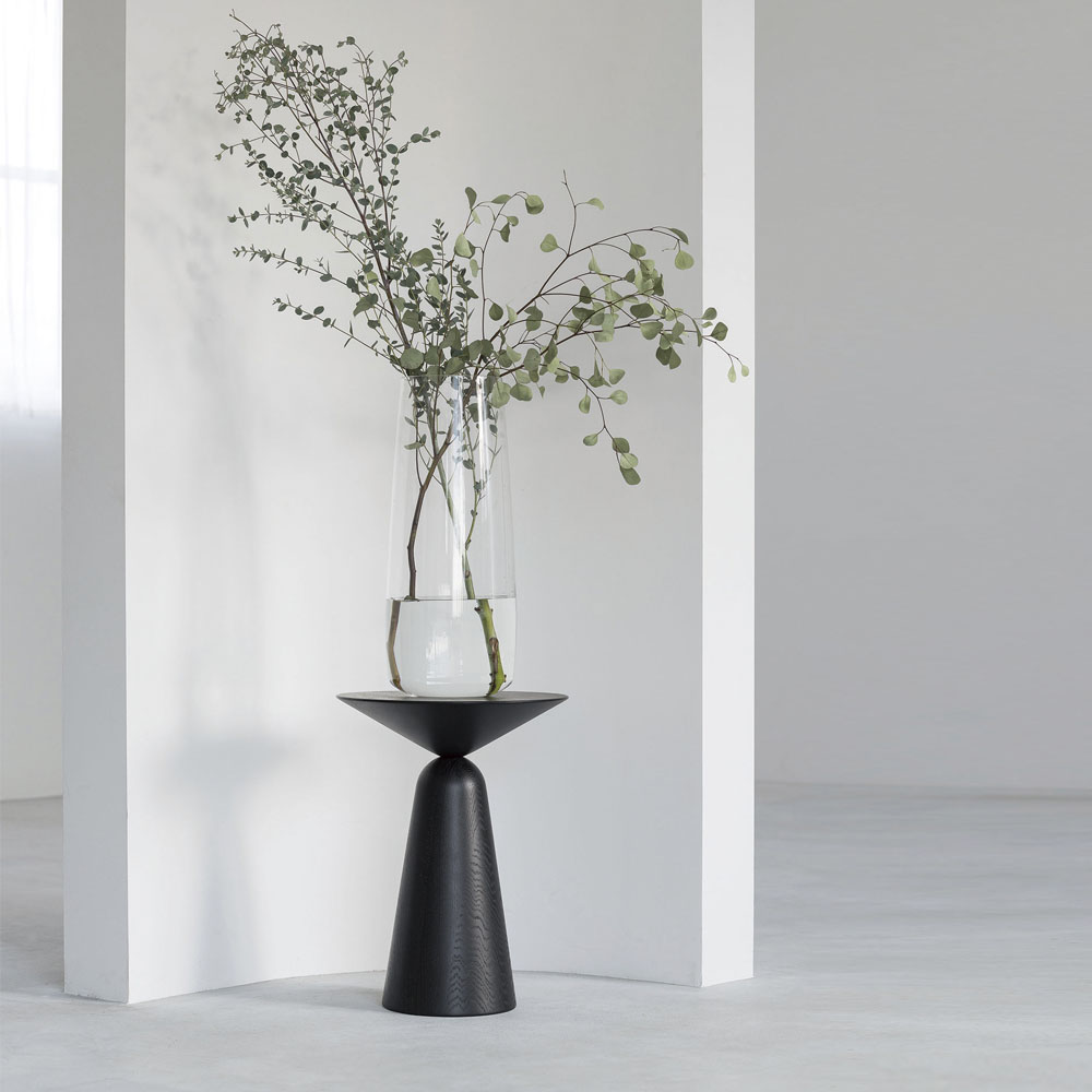 久々にサイドテーブルの新作をご用意しました。絶妙なバランス感で目を引くのが、円すいの頂点同士で支え合うジオメトリックなシルエット。ミニマルなデザインは和の空間にもしっくりと馴染みます。ゆるやかにつけられたアールによって光が回り込むように反射することで、木の自然な風合いや質感を最大限に引き出し、木目の美しさや豊かさを感じ取ることができます。贅沢に使用されたオーク材の手触りも楽しめ、木の高級感と重厚感がありながらも、収まりのいい低めのサイズ感で落ち着きを与えます。