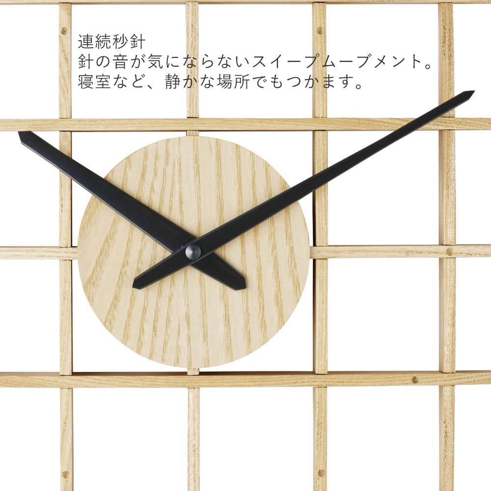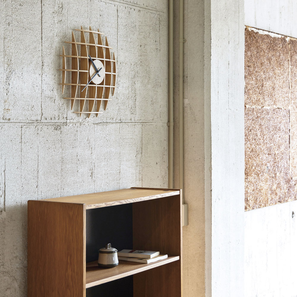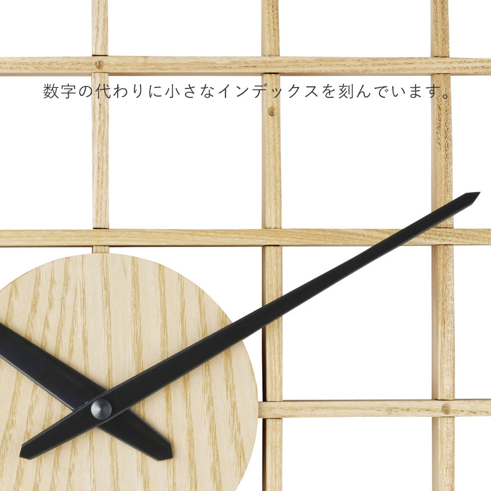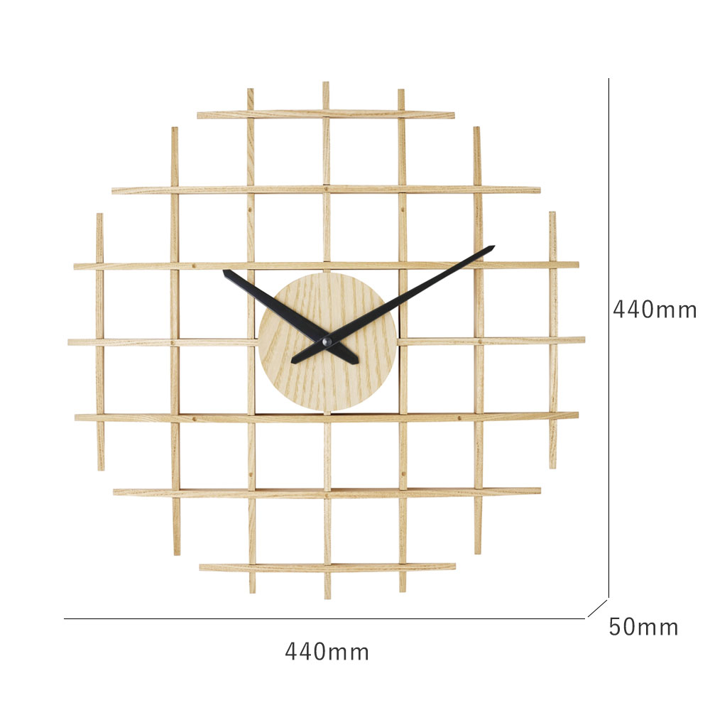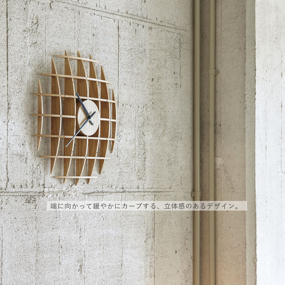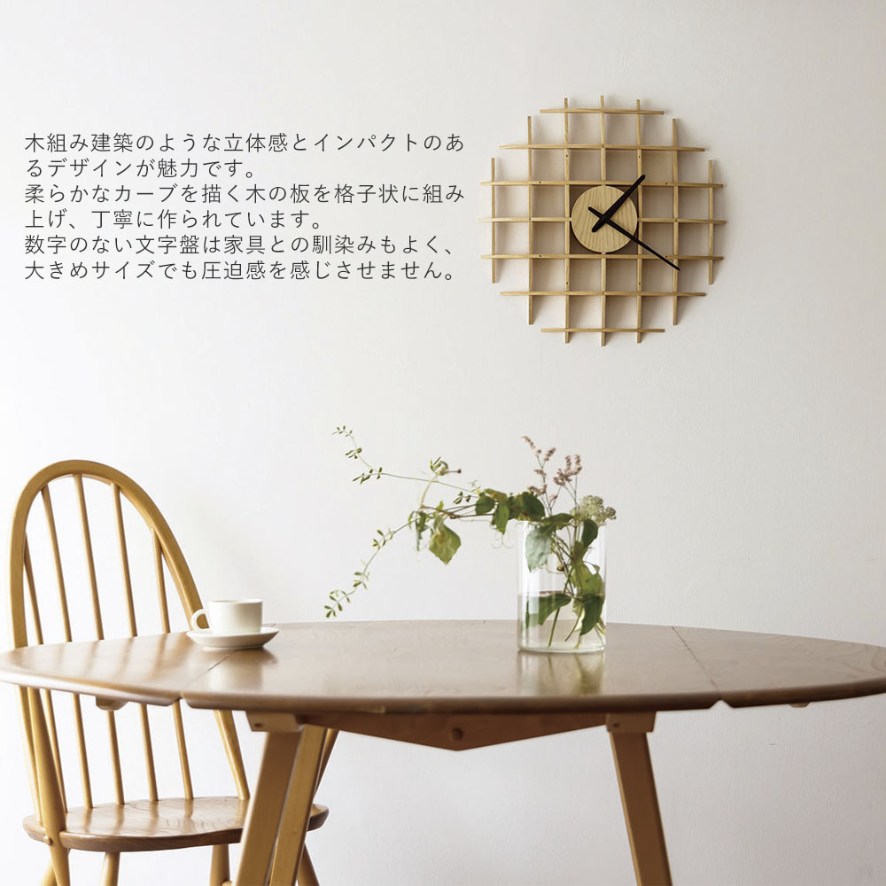 木組み建築のような立体感とインパクトのあるデザインが魅力です。柔らかなカーブを描く木の板を格子状に組み上げ、丁寧に作られています。数字のない文字盤は家具との馴染みもよく、大きめサイズでも圧迫感を感じさせません。