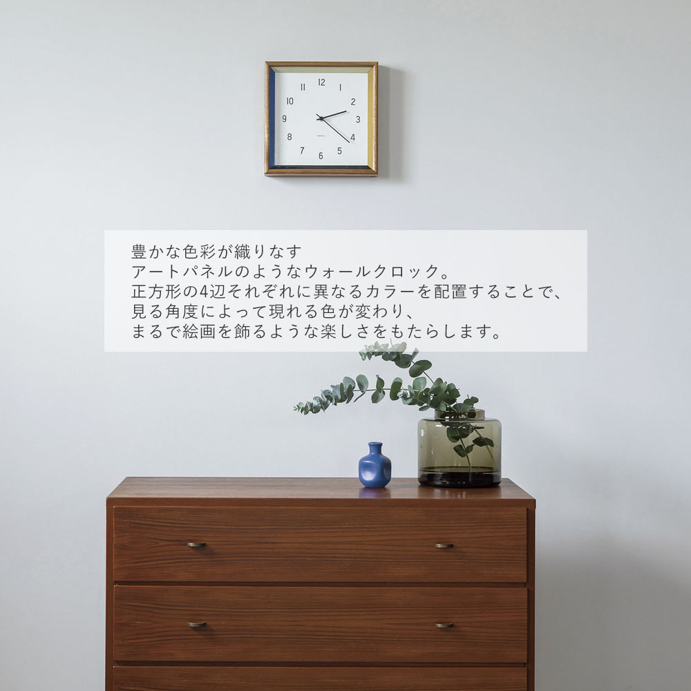 豊かな色彩が織りなすアートパネルのようなウォールクロック。正方形の4辺それぞれに異なるカラーを配置することで、見る角度によって現れる色が変わり、まるで絵画を飾るような楽しさをもたらします。