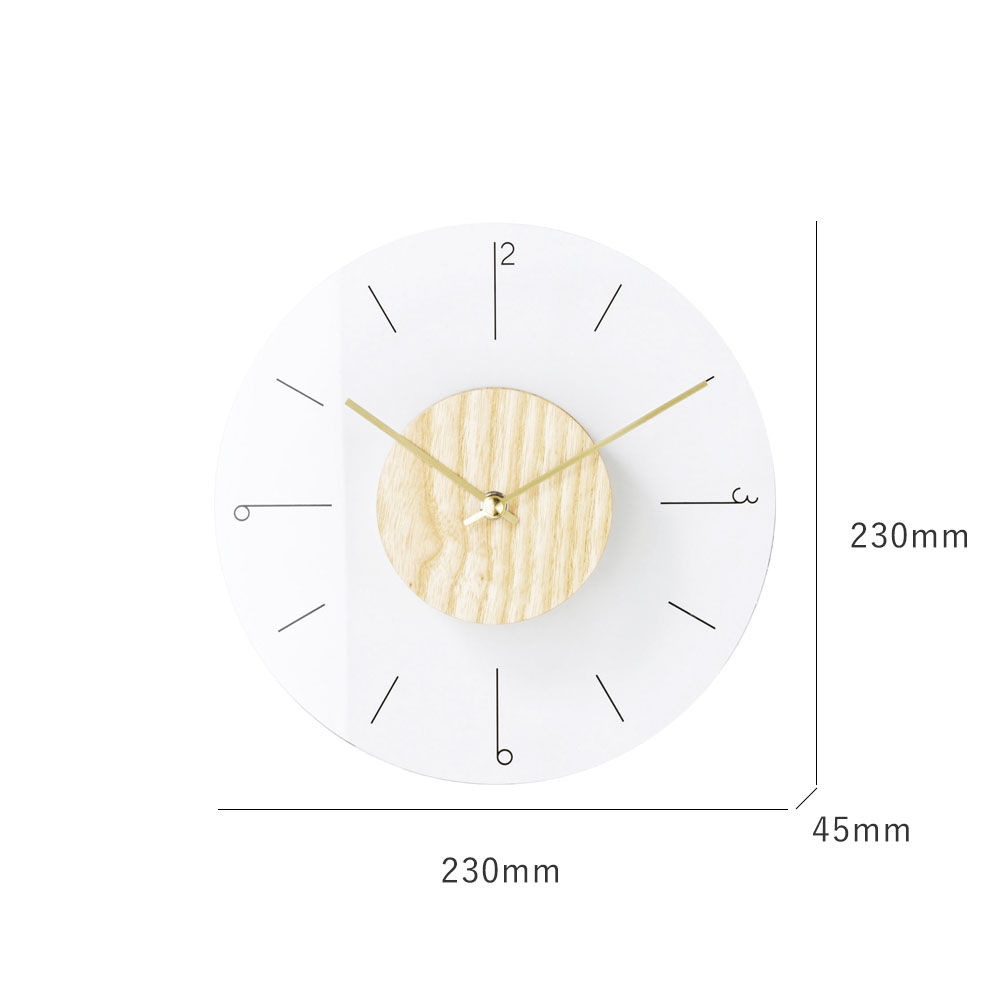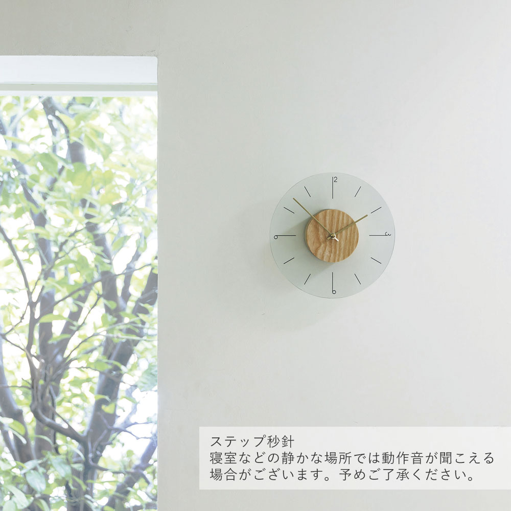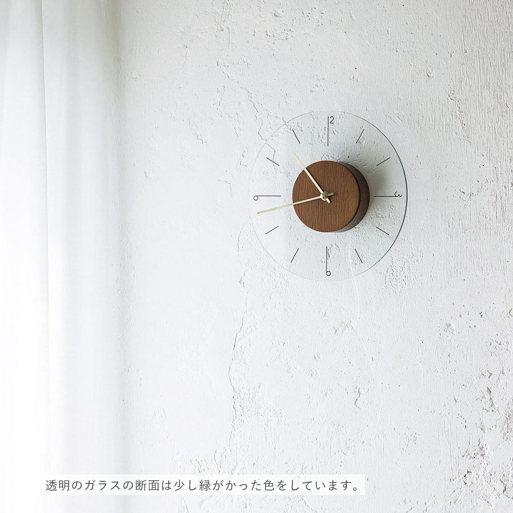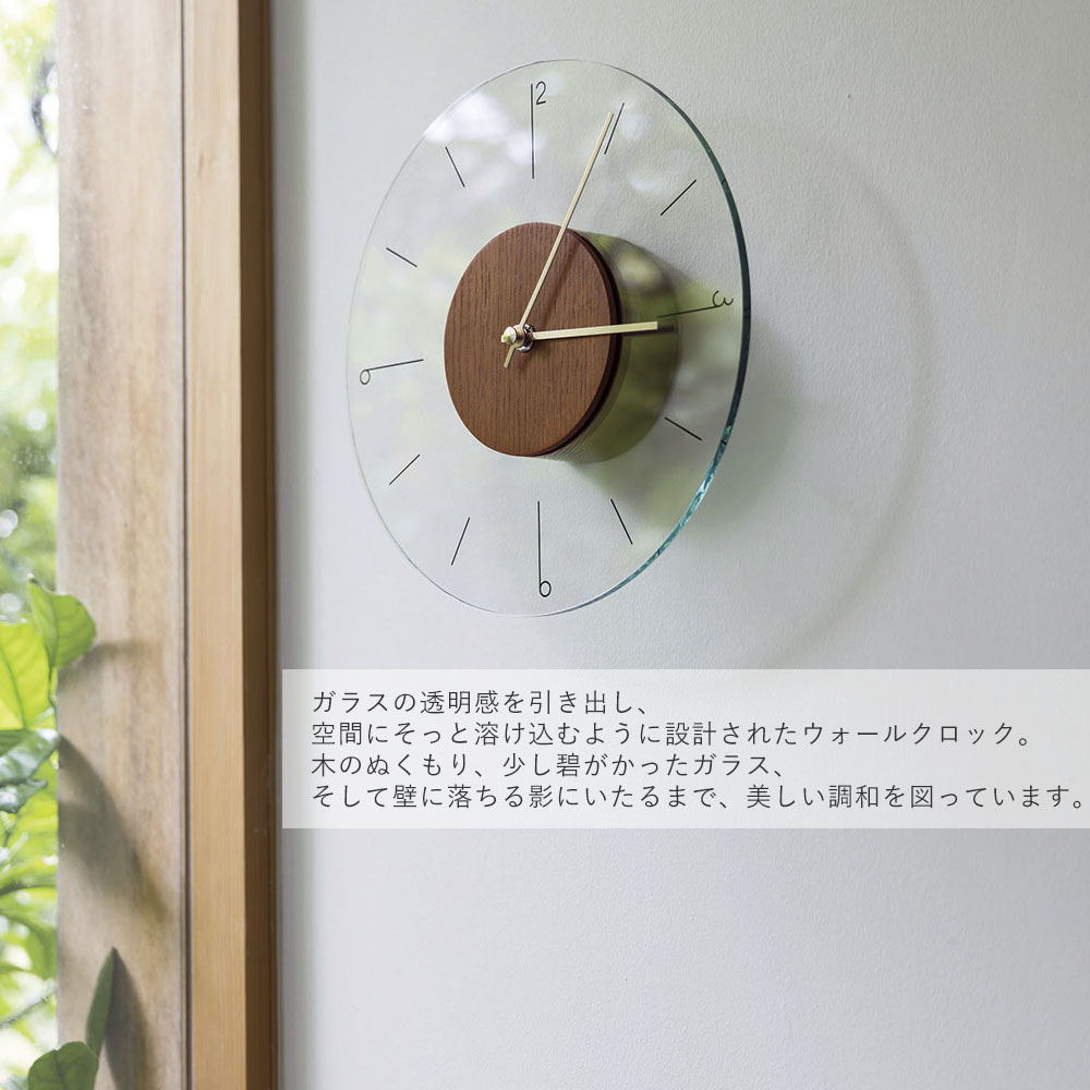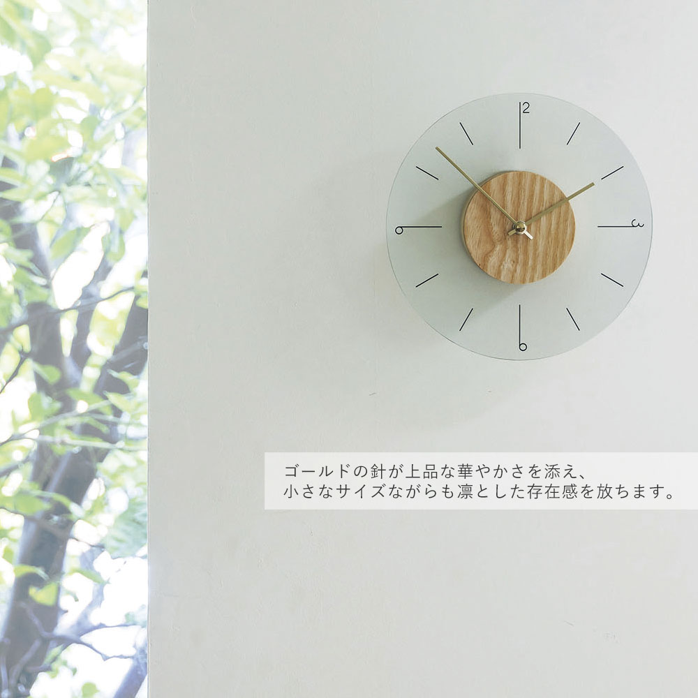 ガラスの透明感を引き出し、空間にそっと溶け込むように設計されたウォールクロック。木のぬくもり、少し碧がかったガラス、そして壁に落ちる影にいたるまで、美しい調和を図っています。ゴールドの針が上品な華やかさを添え、小さなサイズながらも凛とした存在感を放ちます。