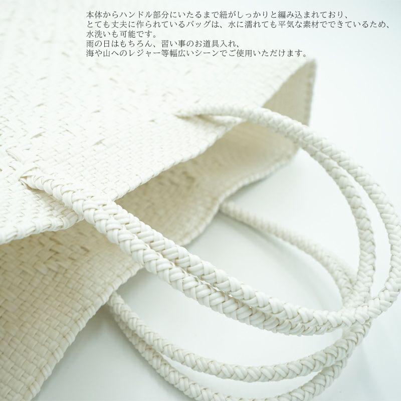 ハンドメイドならではのぬくもりが感じられ、雰囲気があるアイテムです。本体からハンドル部分にいたるまで紐がしっかりと編み込まれており、とても丈夫に作られているバッグは、水に濡れても平気な素材でできているため、水洗いも可能です。雨の日はもちろん、習い事のお道具入れ、海や山へのレジャー等幅広いシーンでご使用いただけます。