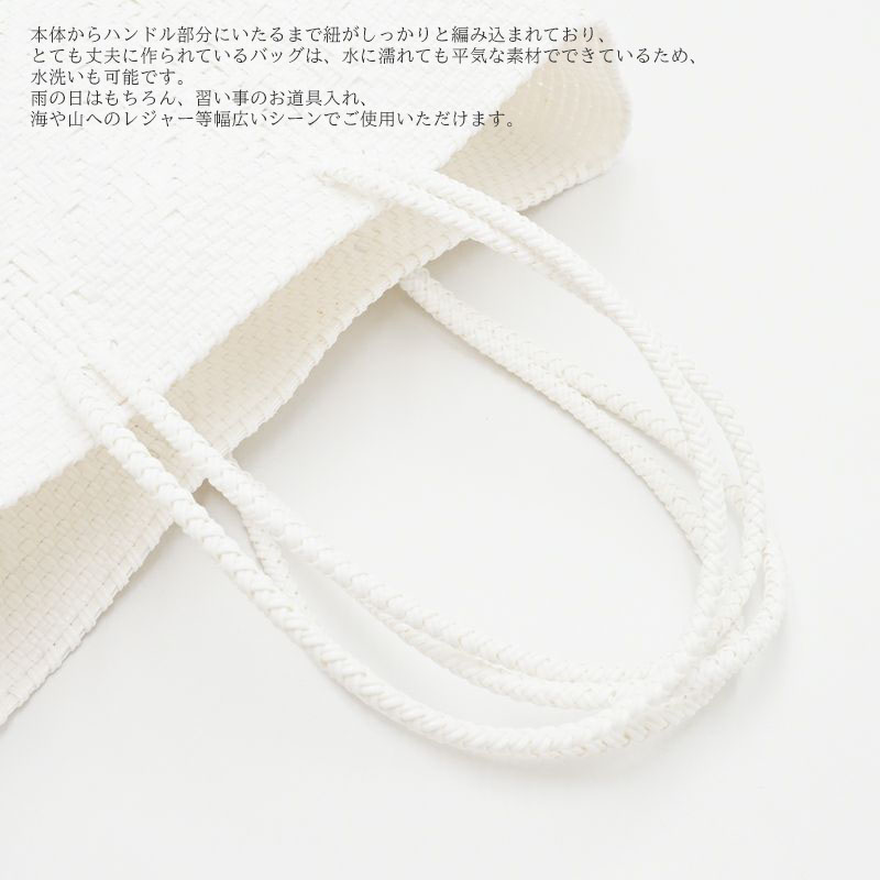ハンドメイドならではのぬくもりが感じられ、雰囲気があるアイテムです。本体からハンドル部分にいたるまで紐がしっかりと編み込まれており、とても丈夫に作られているバッグは、水に濡れても平気な素材でできているため、水洗いも可能です。雨の日はもちろん、習い事のお道具入れ、海や山へのレジャー等幅広いシーンでご使用いただけます。