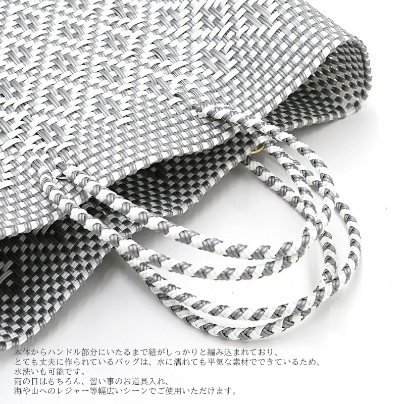 バッグは、本体からハンドル部分に至るまで、紐がしっかりと編み込まれており、丈夫に作られています。水に濡れても平気な素材なので、水洗いも可能。雨の日はもちろん、習い事のお道具入れ、海・山へのレジャー、キッチンなどでも使えるところが◎。メキシコに暮らす職人たちによってひとつずつ丁寧に作られるメルカドバッグ。