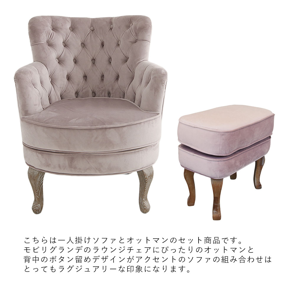 小ぶりな一人掛けソファ。とオットマンのスペシャルセット価格が期間限定で登場★単体でも絵になるフォルム。他のデザインのソファと組み合わせても相性良しのすぐれもの。場所を取らないコンパクトな一人掛けソファです。背中のボタン留めデザインがアクセント。小ぶりながら存在感があります。肌触りのよいベルベット素材とナチュラルなリネン混紡素材。