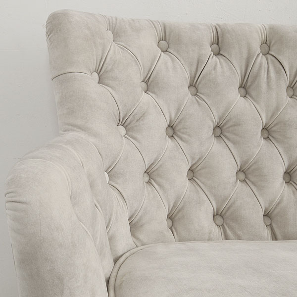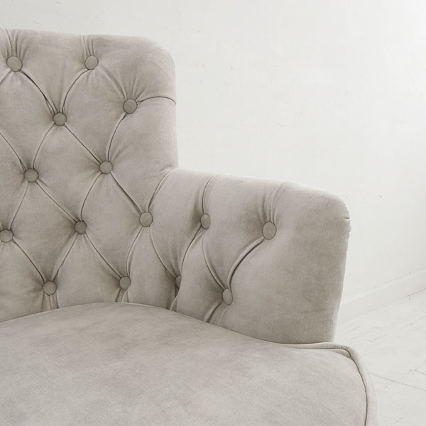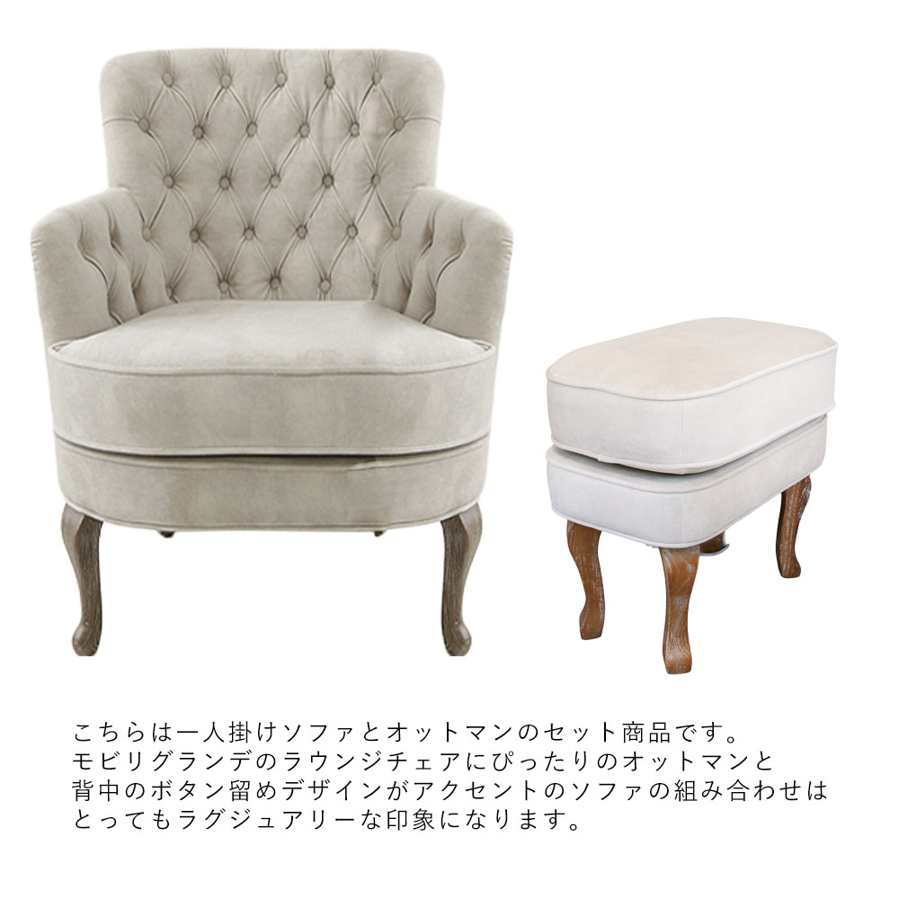 小ぶりな一人掛けソファ。とオットマンのスペシャルセット価格が期間限定で登場★単体でも絵になるフォルム。他のデザインのソファと組み合わせても相性良しのすぐれもの。場所を取らないコンパクトな一人掛けソファです。背中のボタン留めデザインがアクセント。小ぶりながら存在感があります。肌触りのよいベルベット素材とナチュラルなリネン混紡素材。