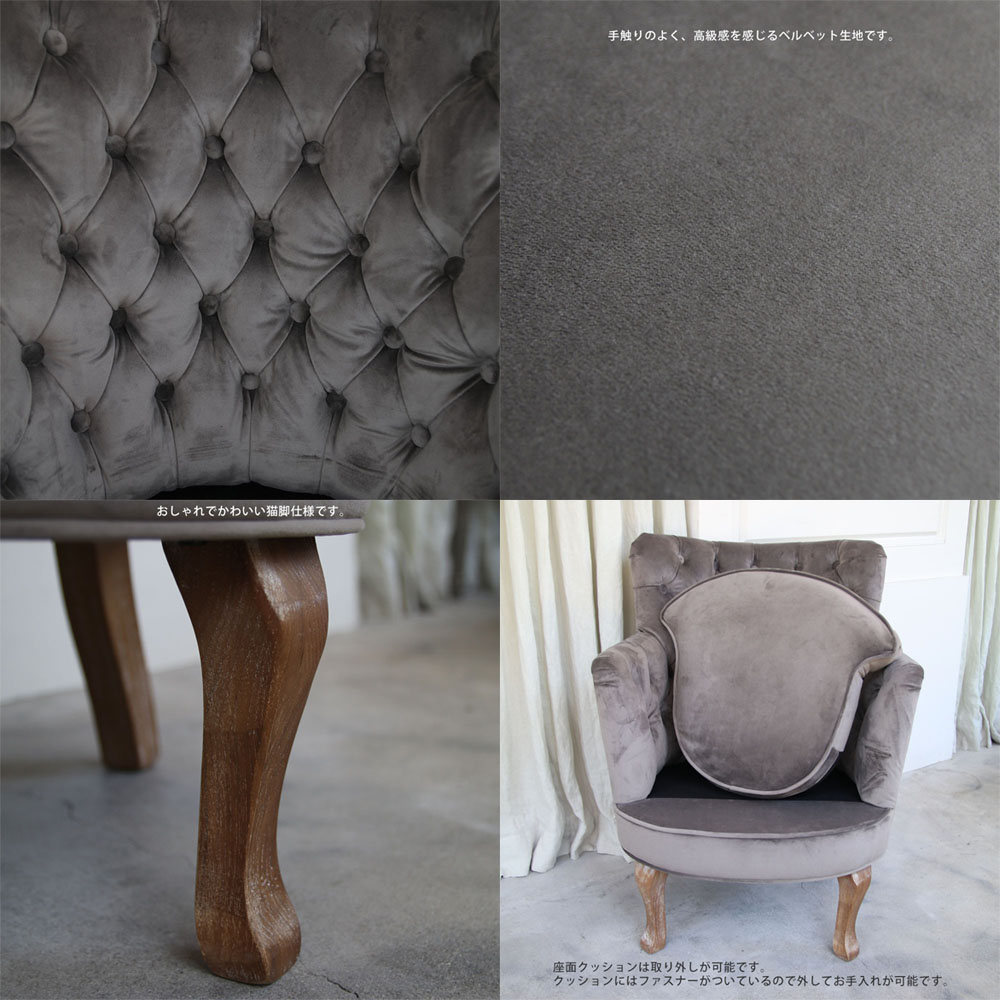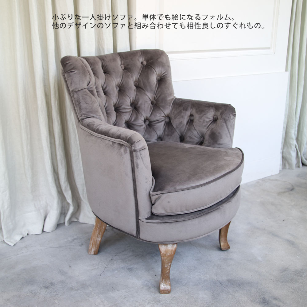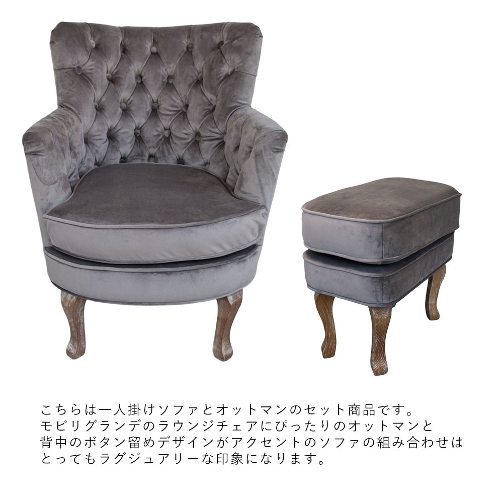 小ぶりな一人掛けソファ。とオットマンのスペシャルセット価格が期間限定で登場★単体でも絵になるフォルム。他のデザインのソファと組み合わせても相性良しのすぐれもの。場所を取らないコンパクトな一人掛けソファです。背中のボタン留めデザインがアクセント。小ぶりながら存在感があります。肌触りのよいベルベット素材とナチュラルなリネン混紡素材。