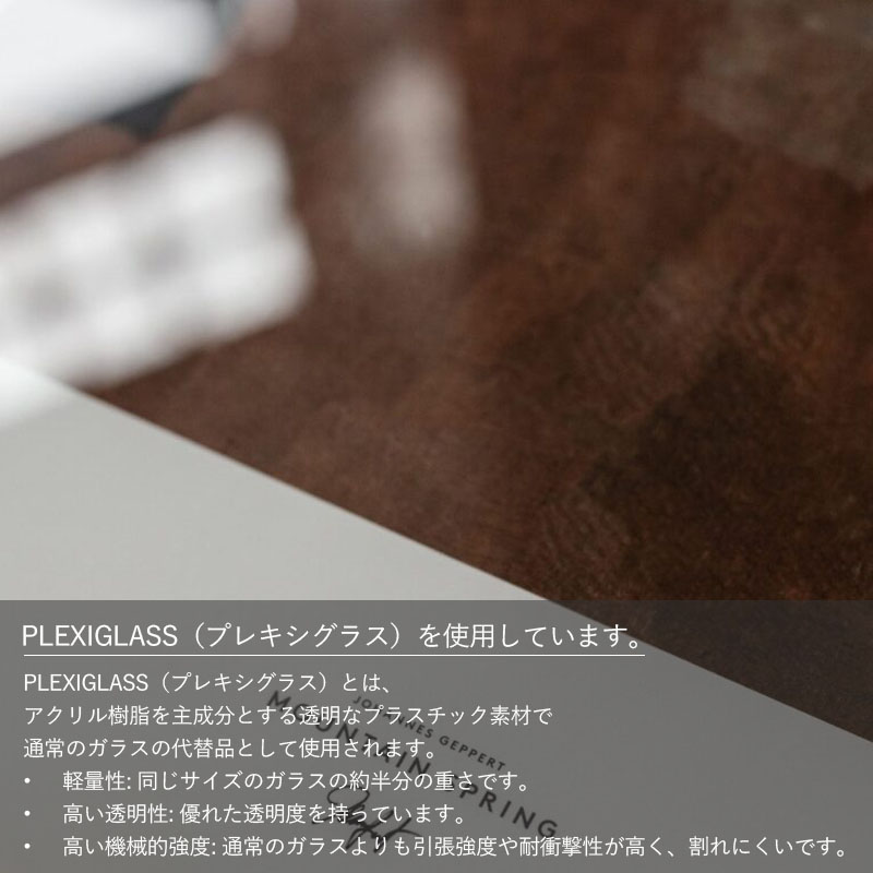 | 表面クリア面 | プレキシグラス:プレキシグラス(アクリル樹脂)は、現代の設計において「理想的なガラスの代替品」として高く評価されている高分子素材です。その最大の魅力は、「ガラスを超える透明感」と「圧倒的な扱いやすさ」の両立にあります。重さは一般的なガラスのわずか半分程度と極めて軽量でありながら、引張強度や耐衝撃性においてはガラスを大きく上回る堅牢さを備えています。万が一の破損時も破片が鋭利になりにくいため、安全性と意匠性が同時に求められる建築、インテリア、ディスプレイなどの幅広い分野で不可欠な存在となっています。※表面は光沢感があり、中に入れるポスター(黒いなど暗い色)によっては鏡面になる場合がございます。 |