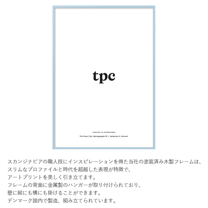 スカンジナビアの職人技にインスピレーションを得たポスタークラブの塗装済み木製フレームは、スリムなデザインが表現が特徴で、アートプリントを美しく引き立てます。フレームの背面に金属製のハンガーが取り付けられており、 壁に縦にも横にも掛けることができます。※こちらはポスターフレームのみ販売です。ポスターは別途お買い求めくださいませ。
