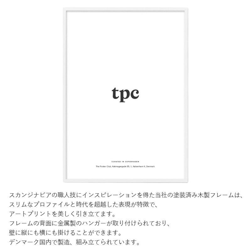 スカンジナビアの職人技にインスピレーションを得たポスタークラブの塗装済み木製フレームは、スリムなデザインが表現が特徴で、アートプリントを美しく引き立てます。フレームの背面に金属製のハンガーが取り付けられており、 壁に縦にも横にも掛けることができます。※こちらはポスターフレームのみ販売です。ポスターは別途お買い求めくださいませ。