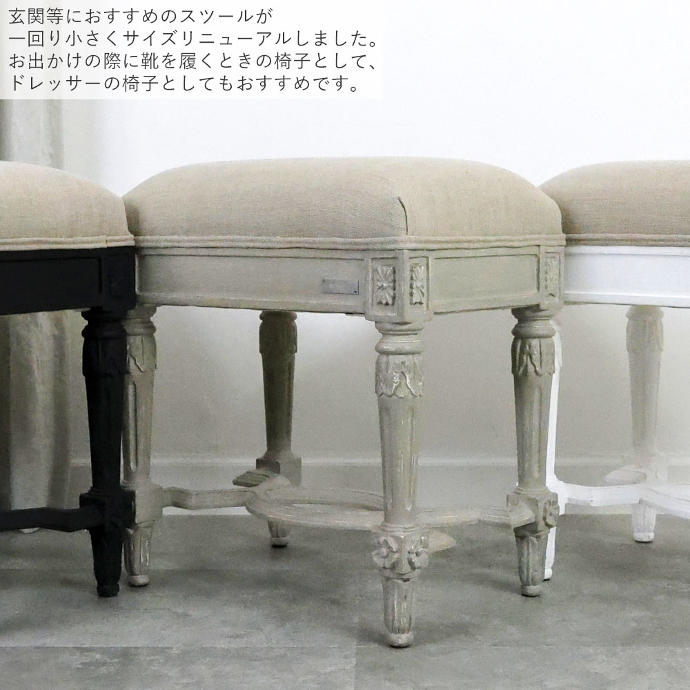 玄関等におすすめのスツールが一回り小さくサイズリニューアルしました。お出かけの際に靴を履くときの椅子として、又ドレッサーの椅子としてもおすすめです。