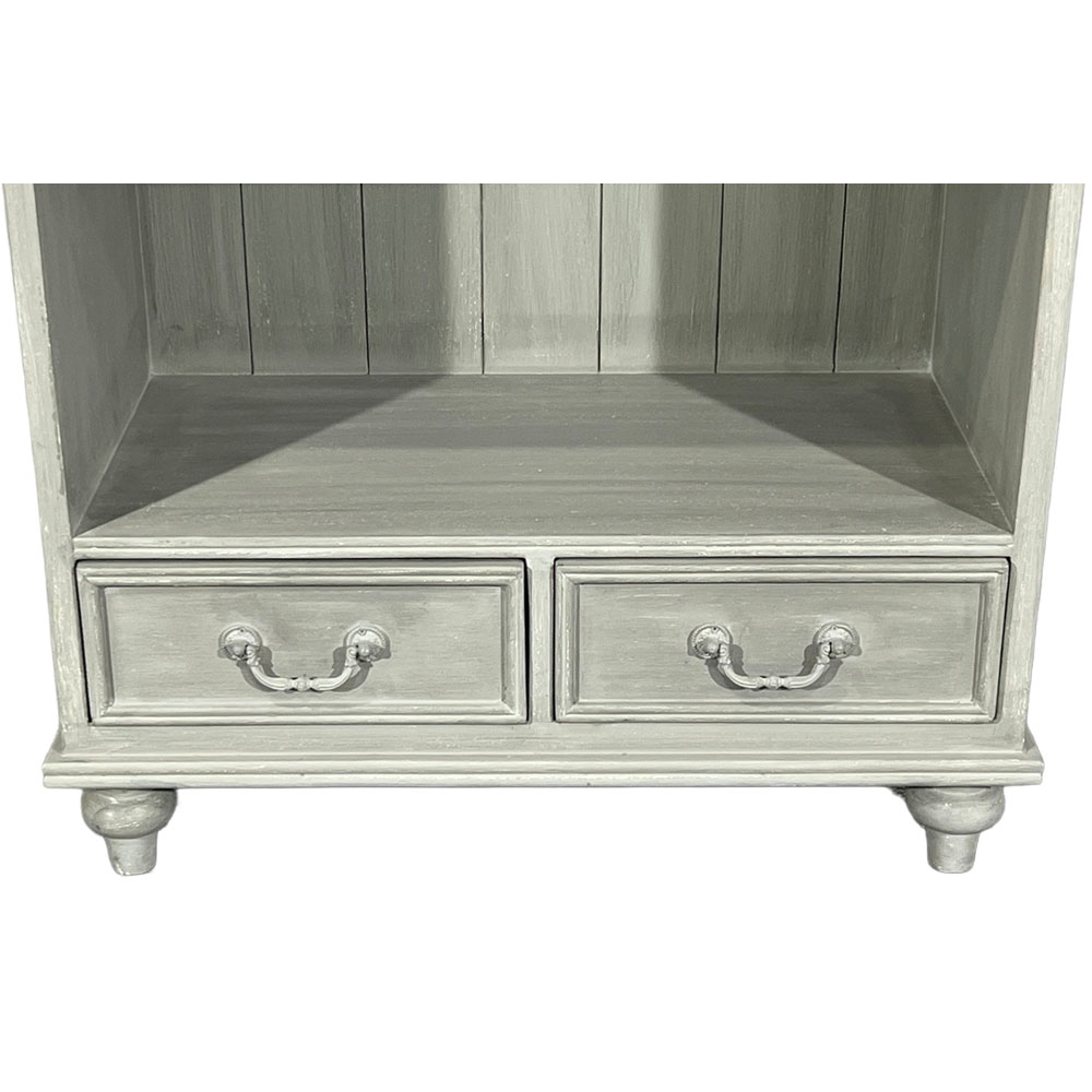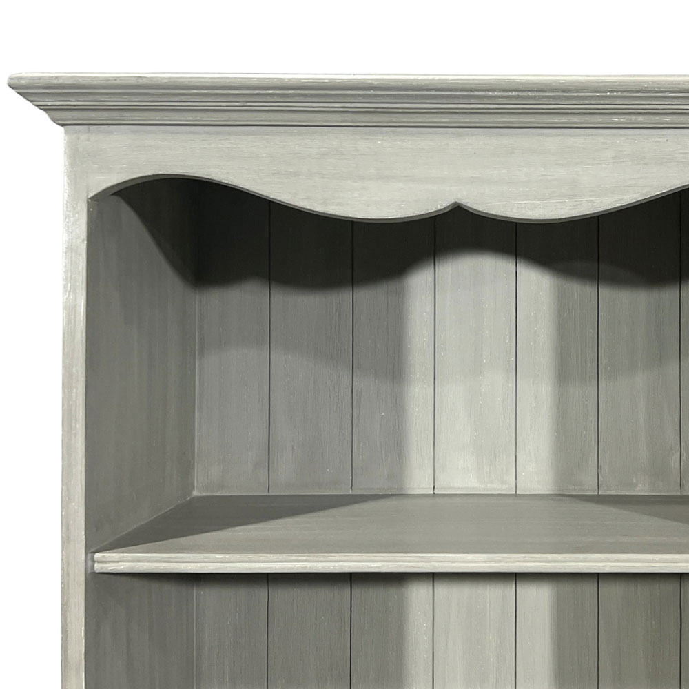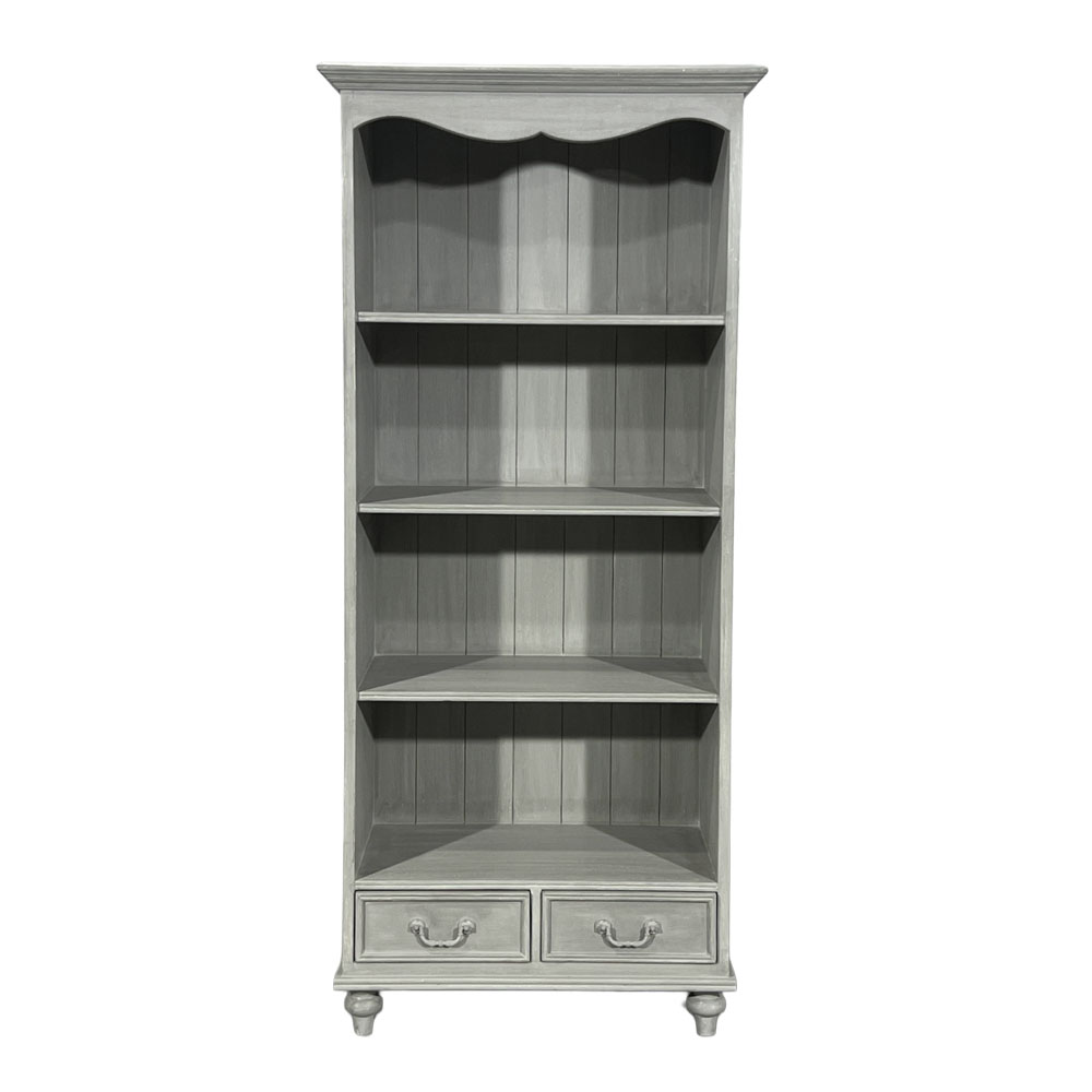 グレーのブックシェルフ。高さが約180cmあり、棚は4段です。上段のデザインがクラシカルでかわいい印象に。下段には引き出しが2杯ついています。もちろん本棚として、ディスプレイラックとしても映える家具です。上品でシャビーなインテリアで穏やかな日々を演出する「Blanc Peinture」シリーズの商品です。