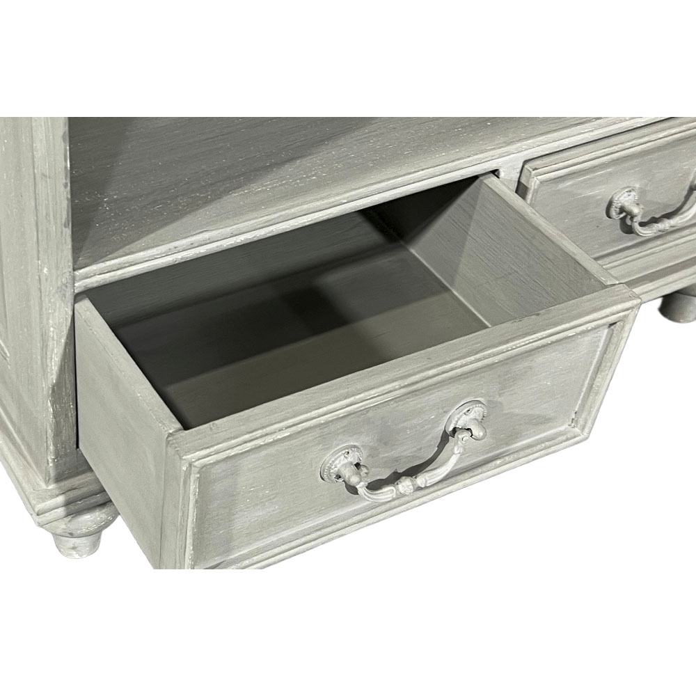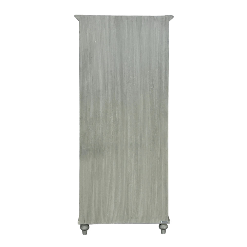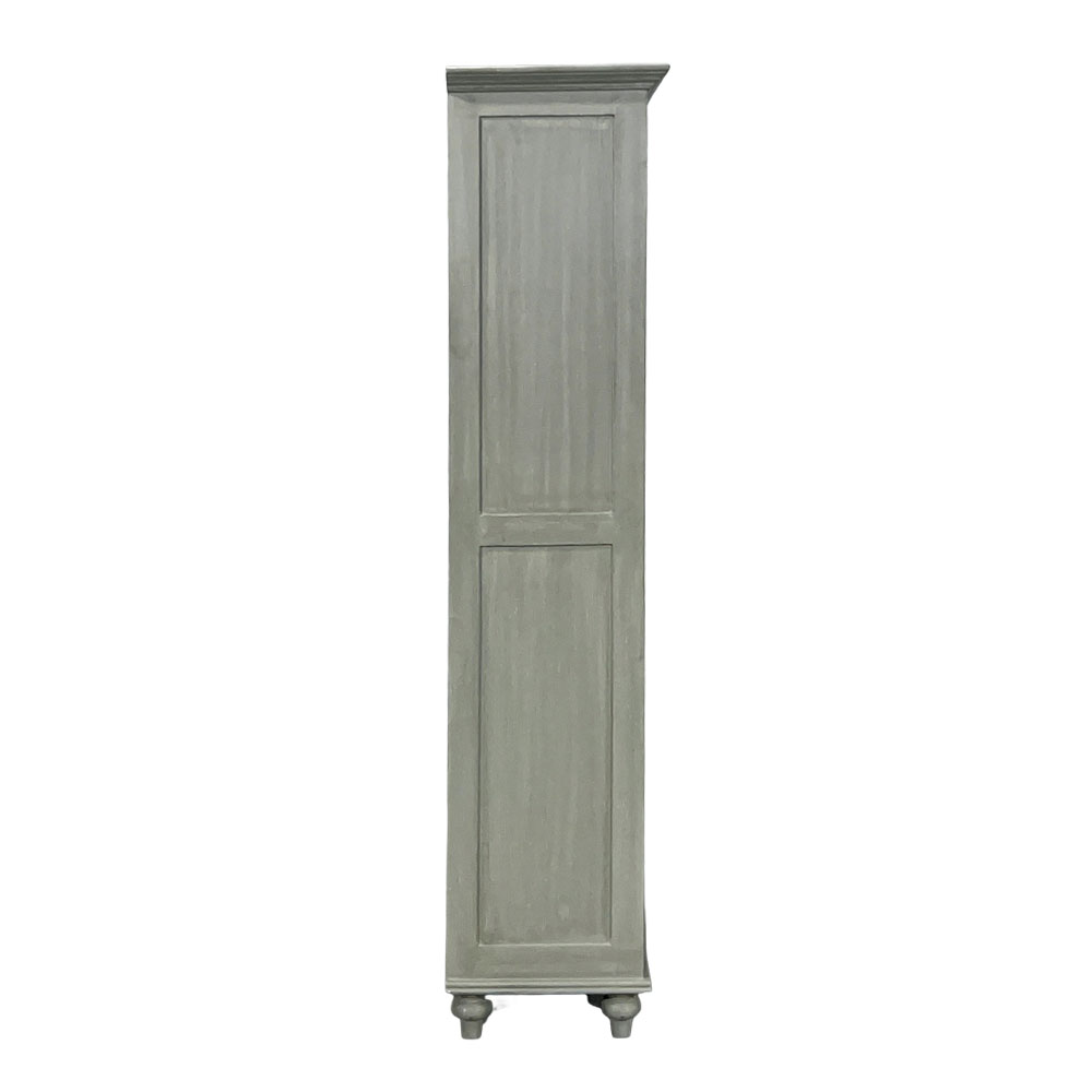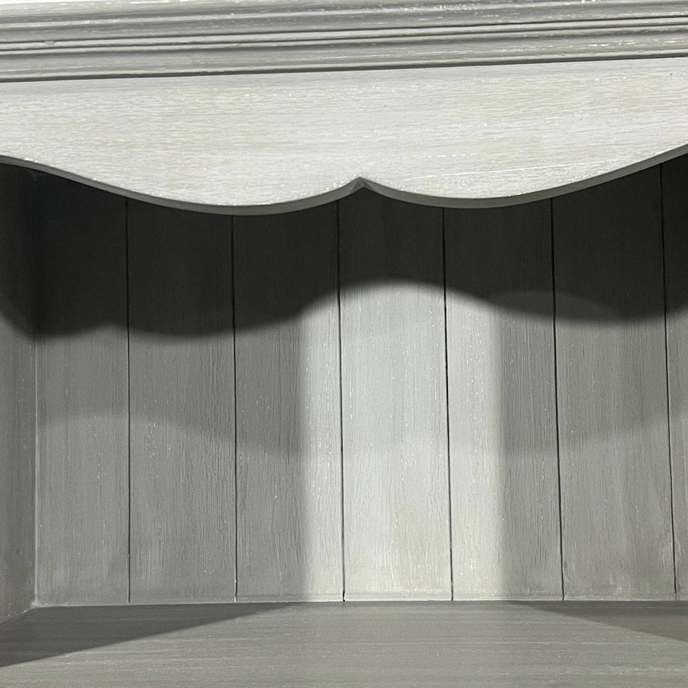 グレーのブックシェルフ。高さが約180cmあり、棚は4段です。上段のデザインがクラシカルでかわいい印象に。下段には引き出しが2杯ついています。もちろん本棚として、ディスプレイラックとしても映える家具です。上品でシャビーなインテリアで穏やかな日々を演出する「Blanc Peinture」シリーズの商品です。