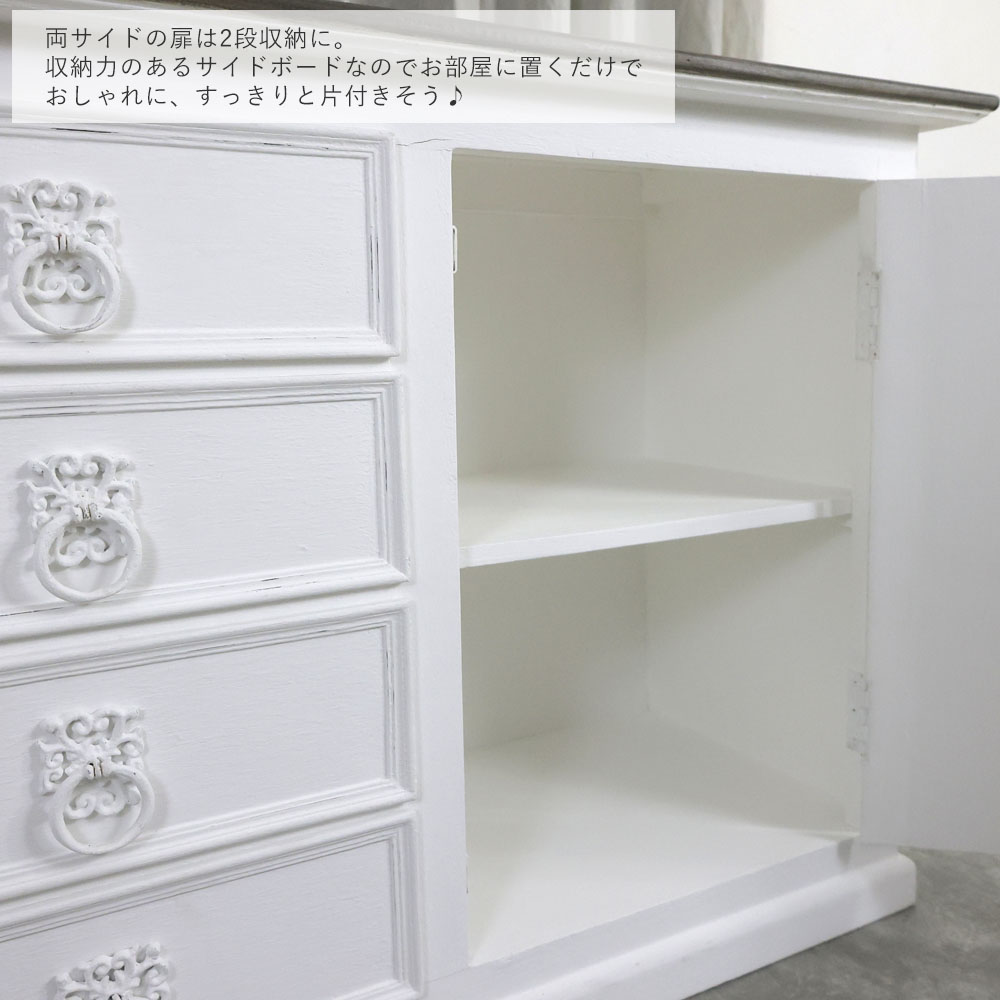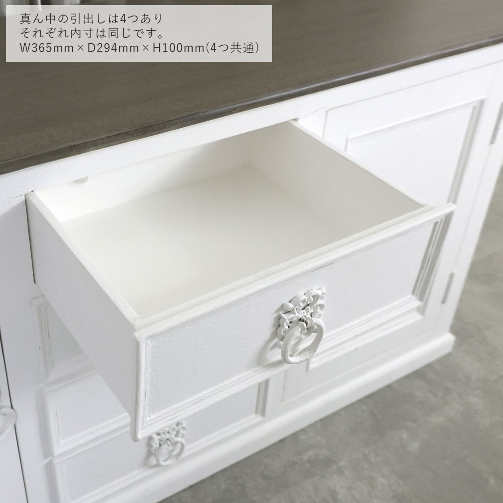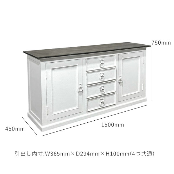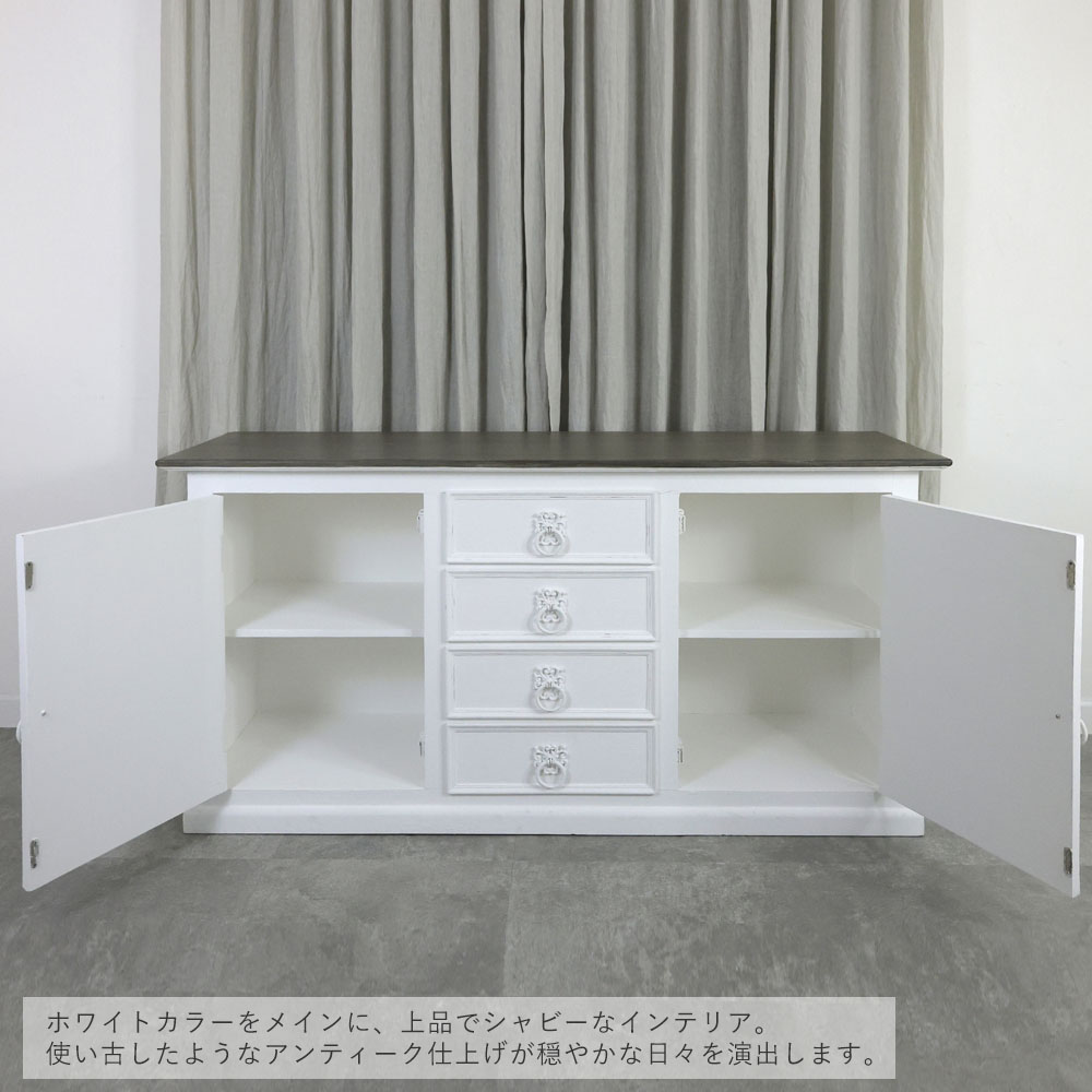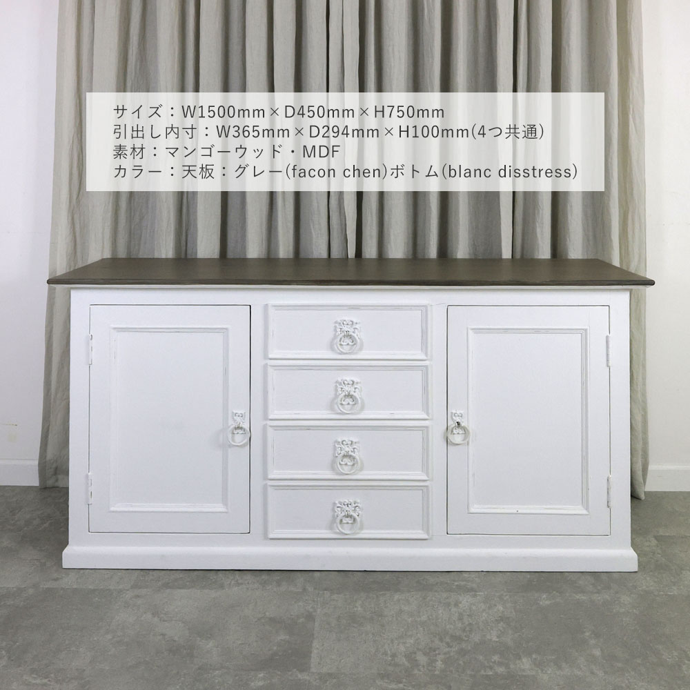 1500サイズのちょうどよい大きさのサイドボード。引出しは4杯、両サイドに棚があるデザインです。上にたくさん飾る事ができるのでポスターやフレンチ系の雑貨を合わせておくのがおすすめです。またカフェやレストランなどの什器としてもおすすめです。グレー、ホワイトをメインカラーに、上品でシャビーなインテリア。使い古したようなアンティーク仕上げが穏やかな日々を演出します。