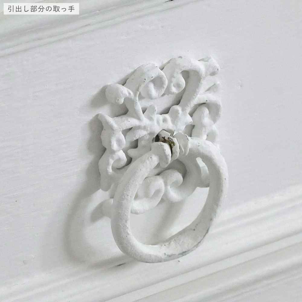 | 注意事項 | 無垢の材料を使用した木製品は環境に応じて水分をすったり、吐き出したりして呼吸しております。水分を吸ったり吐いたりする過程の中で、木の繊維の引っ張り合いがおこり、その結果、表面の塗装に「ヒビ」や割れが起こります。弊社では、塗装表面上のヒビなどは良品の範囲とさせていただいております。不良交換対象とはなりませんので何卒ご理解のほど宜しくお願い致します。 こちらの商品はシャビーなアンティーク加工を施しています。綺麗目をお好みの方はご購入をお控えください。 表面はアンティーク加工の為、凹凸がございます。テーブルなど気になる方はクリアシートをご使用くださいませ。 |
