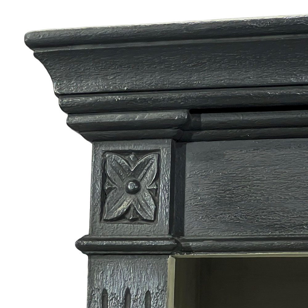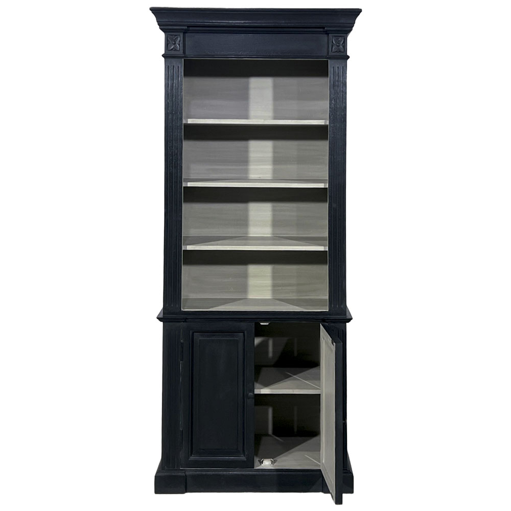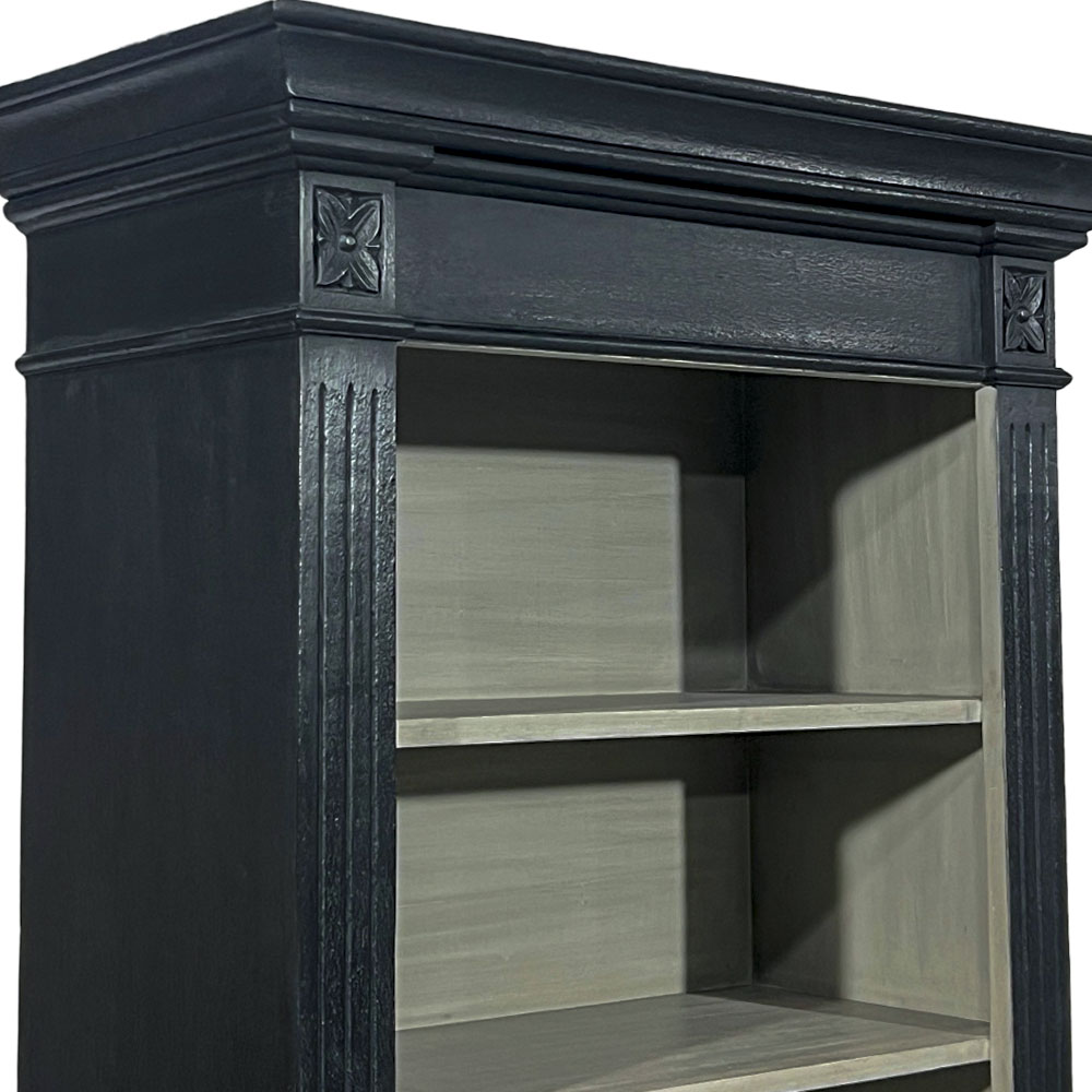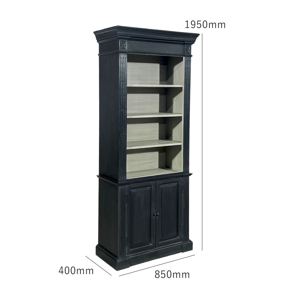 上段は4段の棚、下段は扉付き収納。表面はブラックで中がグレーの収納家具です。キッチンからリビングまで幅広く使えるデザインです。上品でシャビーなインテリアで穏やかな日々を演出する「Blanc Peinture」シリーズの商品です。