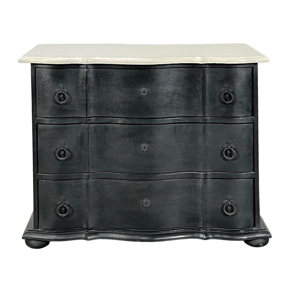 ブラックのボディにグレーの天板の3段チェスト。収納力抜群です。上品でシャビーなインテリアで穏やかな日々を演出する「Blanc Peinture」シリーズの商品です。