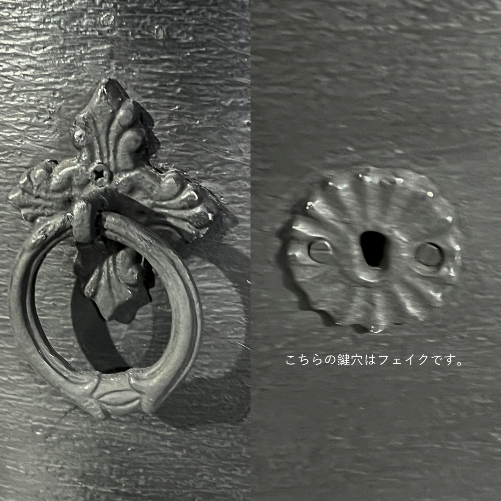 | 注意事項 | 無垢の材料を使用した木製品は環境に応じて水分をすったり、吐き出したりして呼吸しております。水分を吸ったり吐いたりする過程の中で、木の繊維の引っ張り合いがおこり、その結果、表面の塗装に「ヒビ」や割れが起こります。弊社では、塗装表面上のヒビなどは良品の範囲とさせていただいております。不良交換対象とはなりませんので何卒ご理解のほど宜しくお願い致します。 こちらの商品はシャビーなアンティーク加工を施しています。綺麗目をお好みの方はご購入をお控えください。 表面はアンティーク加工の為、凹凸がございます。テーブルなど気になる方はクリアシートをご使用くださいませ。 |