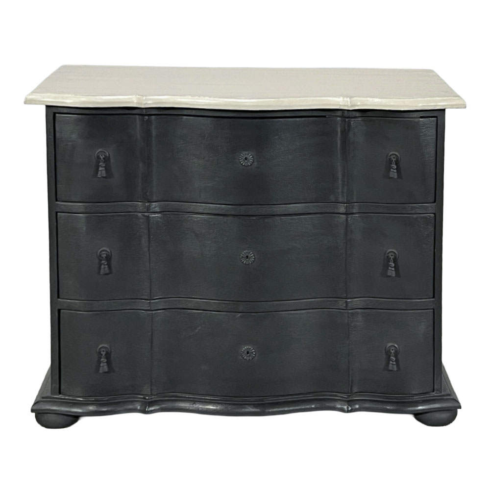 ブラックのボディにグレーの天板の3段チェスト。収納力抜群です。上品でシャビーなインテリアで穏やかな日々を演出する「Blanc Peinture」シリーズの商品です。