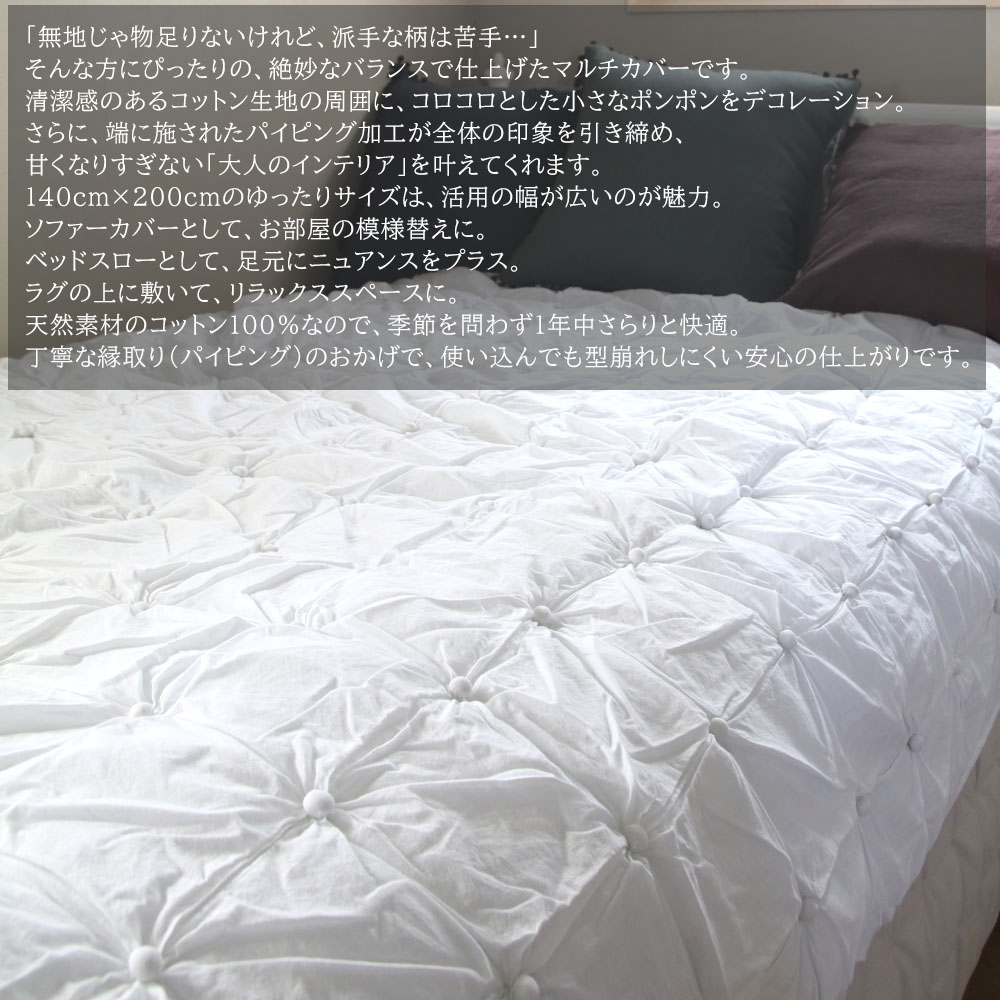 La deco コットン生地マルチカバー ポンポンデザイン ホワイト 140cm×200cm