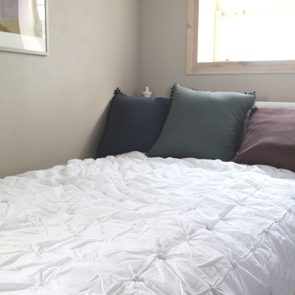 「無地じゃ物足りないけれど、派手な柄は苦手…」そんな方にぴったりの、絶妙なバランスで仕上げたマルチカバーです。清潔感のあるコットン生地の周囲に、コロコロとした小さなポンポンをデコレーション。さらに、端に施されたパイピング加工が全体の印象を引き締め、甘くなりすぎない「大人のインテリア」を叶えてくれます。140cm×200cmのゆったりサイズは、活用の幅が広いのが魅力。ソファーカバーとして、お部屋の模様替えに。ベッドスローとして、足元にニュアンスをプラス。ラグの上に敷いて、リラックススペースに。天然素材のコットンなので、季節を問わず1年中さらりと快適。丁寧な縁取り(パイピング)のおかげで、使い込んでも型崩れしにくい安心の仕上がりです。