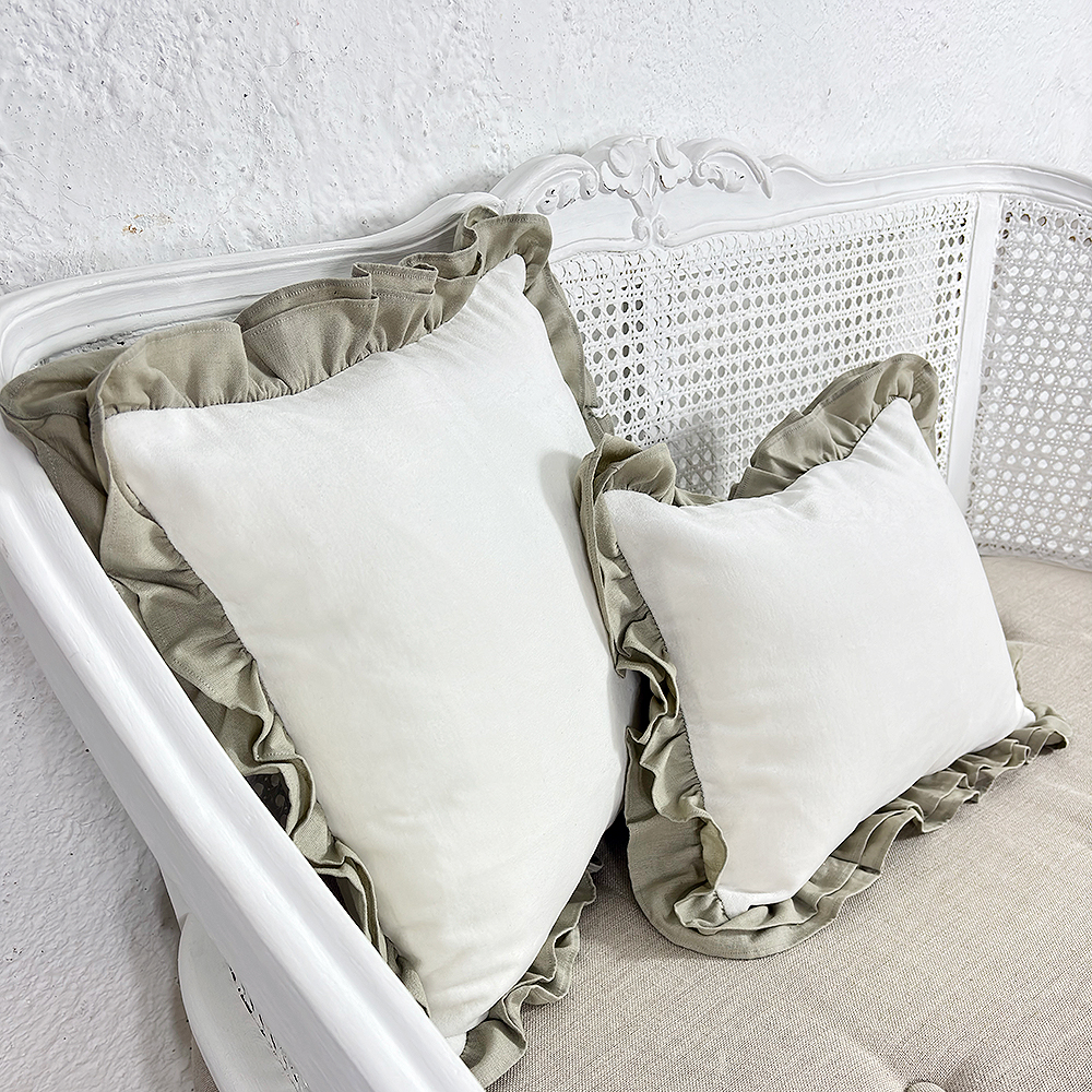 表地は肌触りの良い短毛素材のコットンベルベット、裏地なナチュラルなコットンのクッションカバーです。ダブルフリルをさり気なく取り入れたデザイン。表から見るとダブルフリル、裏から見るとシングルフリルと楽しみ方も様々。リバーシブルなので一年中お使いいただけます。