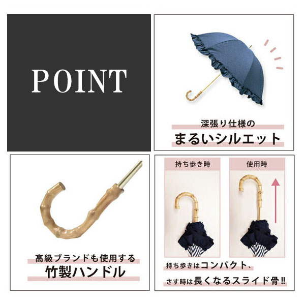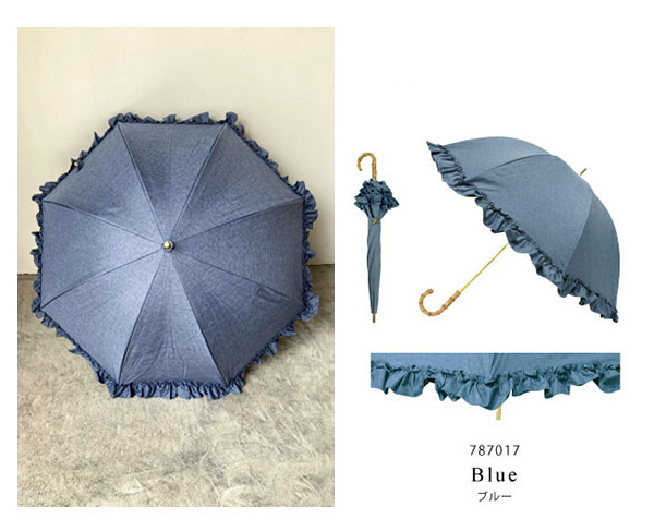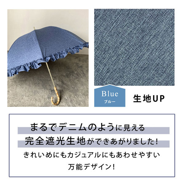 深張り日傘 フリル 直径77cm 晴雨兼用傘 長傘 デニム風ブルー