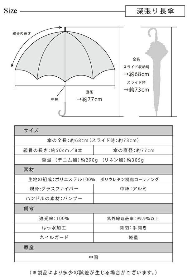 | サイズ | 傘の全長:約68cm(スライド時73cm) 傘の直径:約77cm 親骨の長さ:約50cm/8本 |
