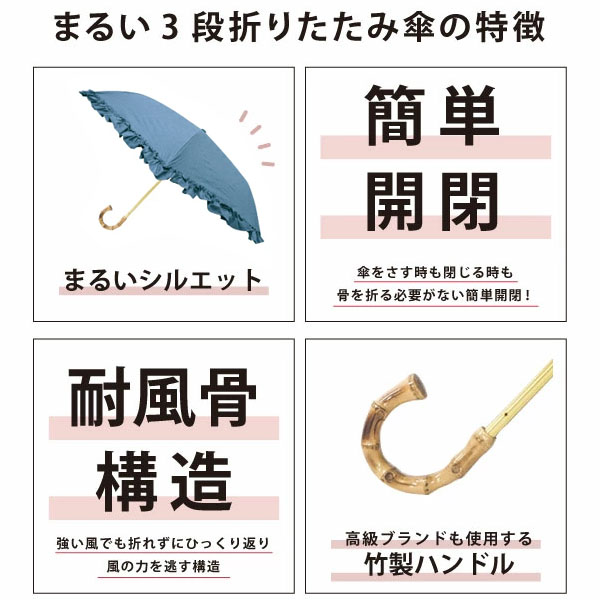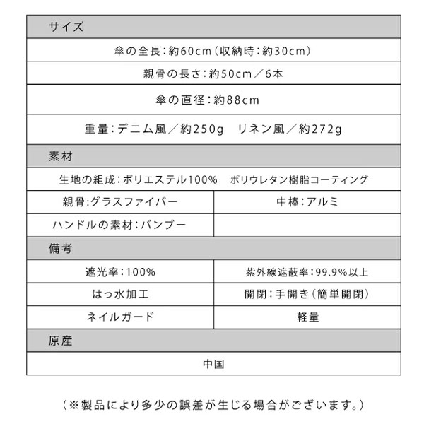 | 素材 | 生地の組成:ポリエステル100%/ポリウレタン樹脂コーディング 親骨の素材:グラスファイバー 中棒の素材:アルミ 持ち手の素材:バンブー |