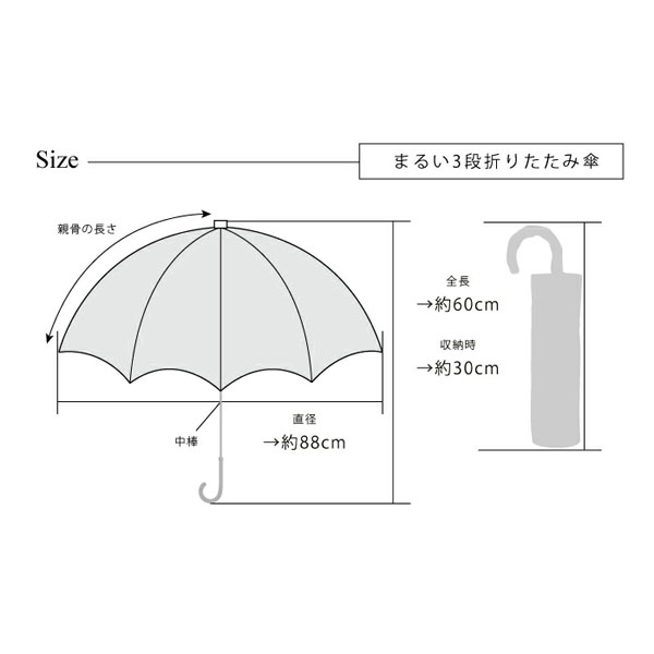| サイズ | 傘の全長:約60cm 傘の直径:約88cm 親骨の長さ:約50cm |