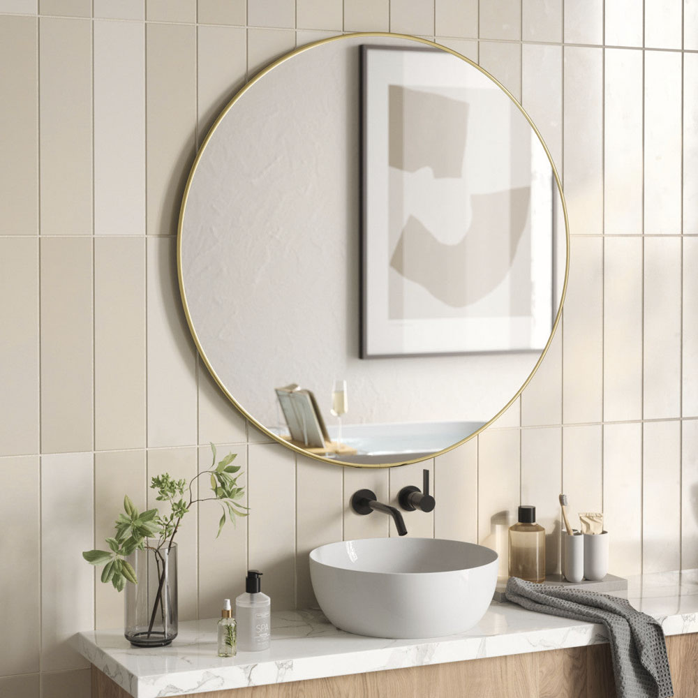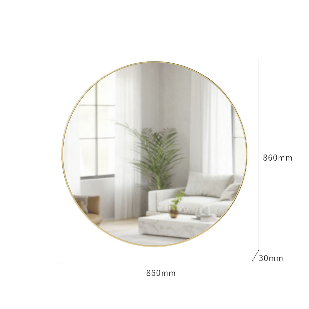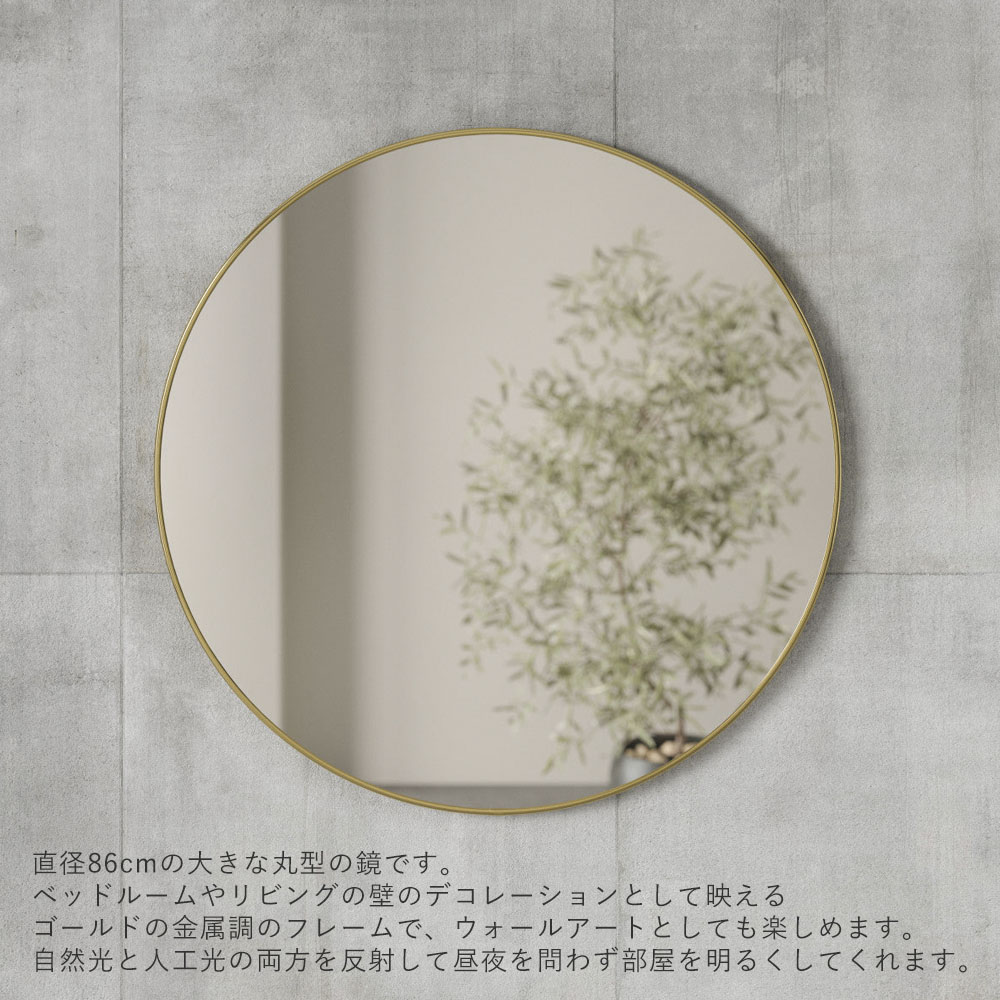 直径86cmの大きな丸型の鏡です。ベッドルームやリビングの壁のデコレーションとして映える金属調のフレームで、ウォールアートとしても楽しめます。自然光と人工光の両方を反射して昼夜を問わず部屋を明るくしてくれます。