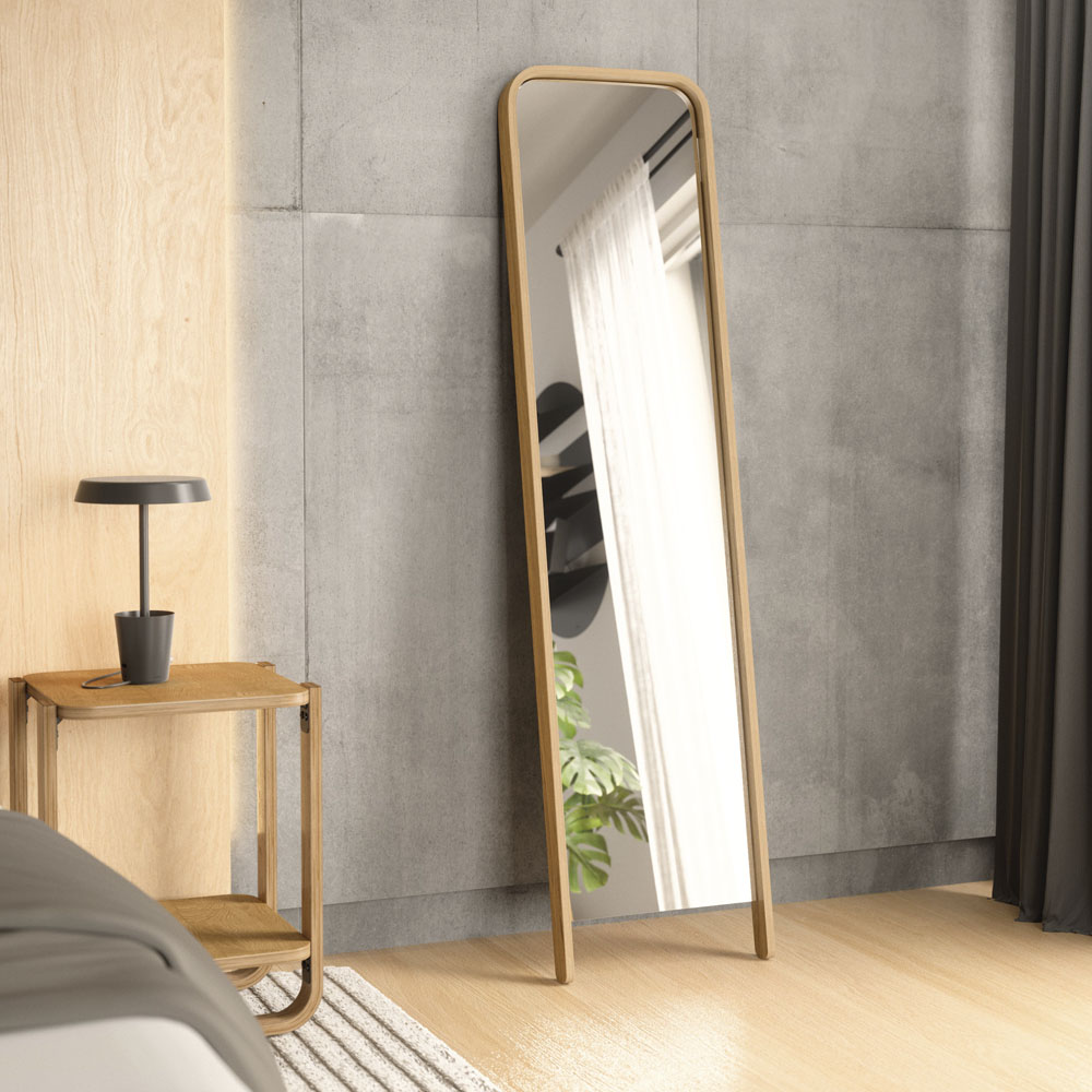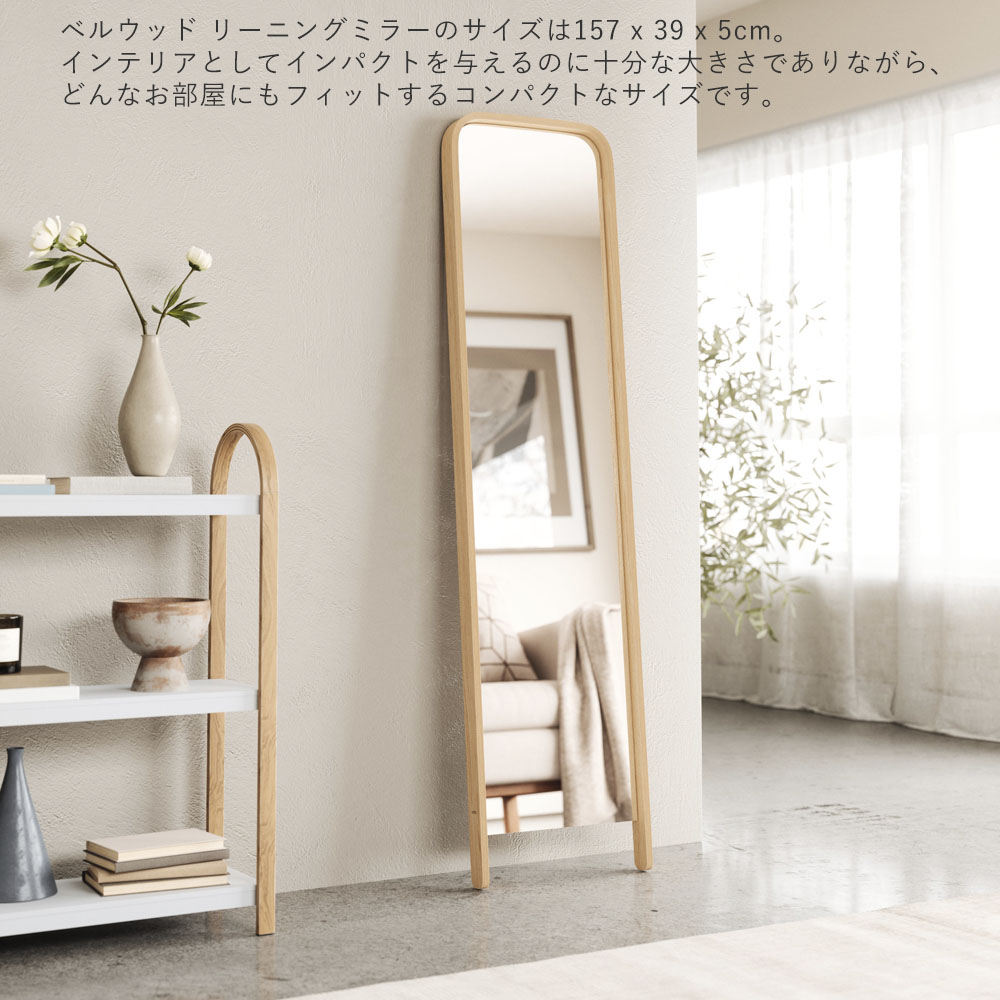 ベルウッド リーニングミラーは、再生可能な木材を使用した柔らかな曲線を描く木製フレームが特徴で、スタイリッシュさと持続可能性の両方を兼ね備えています。ベルウッド リーニングミラーのサイズは157 x 39 x 5cm。インテリアとしてインパクトを与えるのに十分な大きさでありながら、どんなお部屋にもフィットするコンパクトなサイズです。