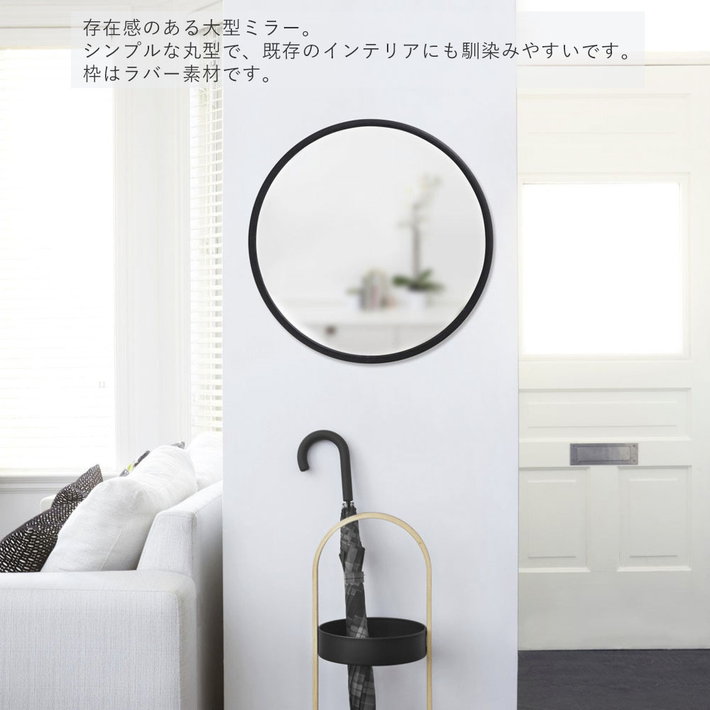 存在感のある大型ミラー。シンプルな丸型で、既存のインテリアにも馴染みやすいです。枠はラバー素材です。