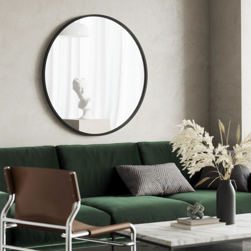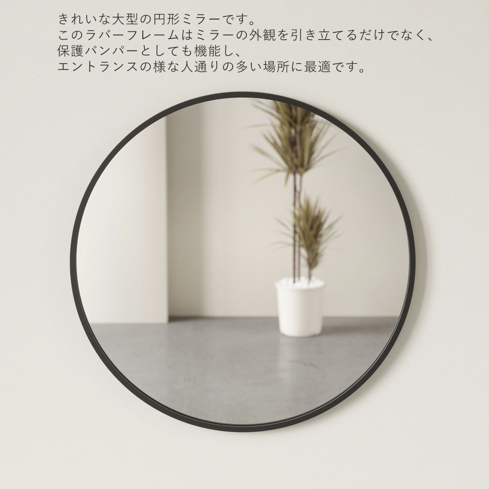 きれいな大型の円形ミラーです。このラバーフレームはミラーの外観を引き立てるだけでなく、保護バンパーとしても機能し、エントランスの様な人通りの多い場所に最適です。