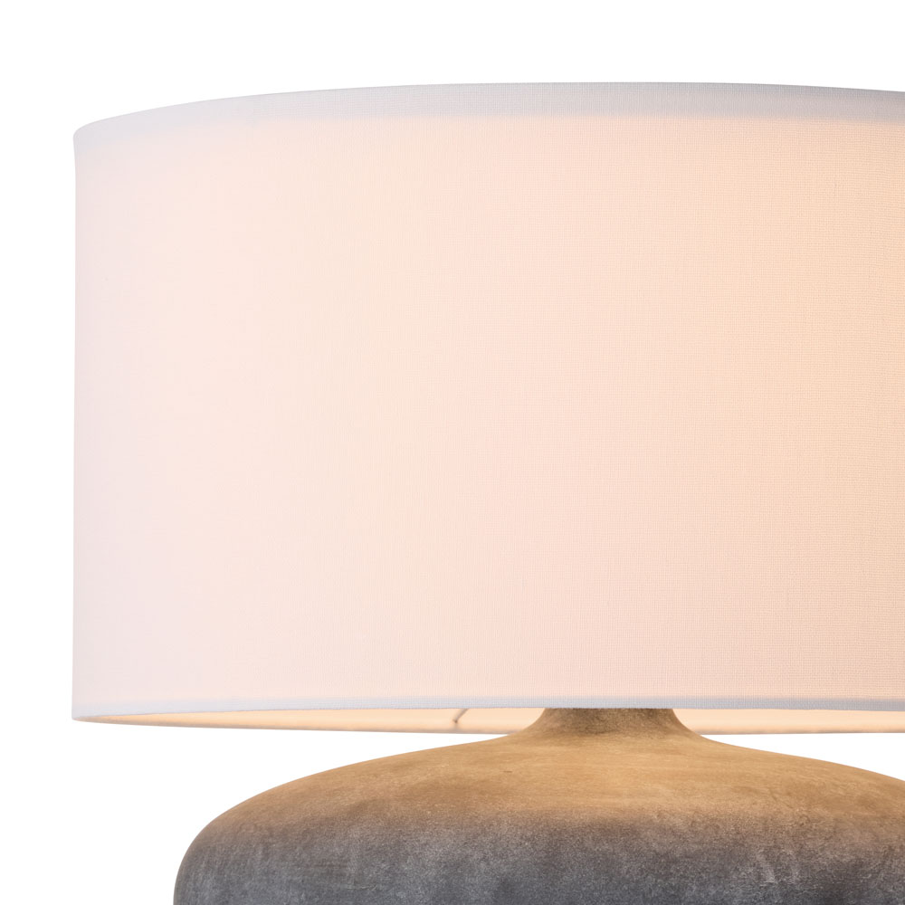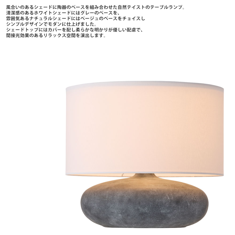 - 風合いのあるシェードに陶器のベースを組み合わせた自然テイストのテーブルランプ。2種類のフォルムでそれぞれベーシックな(S)サイズと存在感のある(L)サイズをご用意し、清潔感のあるホワイトシェードにはグレーのベースを、雰囲気あるナチュラルシェードにはベージュのベースをチョイスしシンプルデザインでモダンに仕上げました。シェードトップにはカバーを配し柔らかな明かりが優しい配慮で、間接光効果のあるリラックス空間を演出します。
