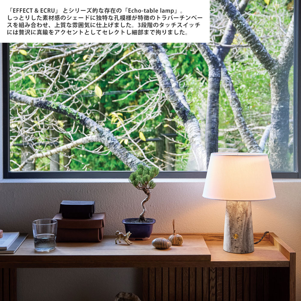 - 「EFFECT & ECRU」 とシリーズ的な存在の「Echo-table lamp」。しっとりした素材感のシェードに独特な孔模様が特徴のトラバーチンベースを組み合わせ、上質な雰囲気に仕上げました。3段階のタッチスイッチには贅沢に真鍮をアクセントとしてセレクトし細部まで拘りました。